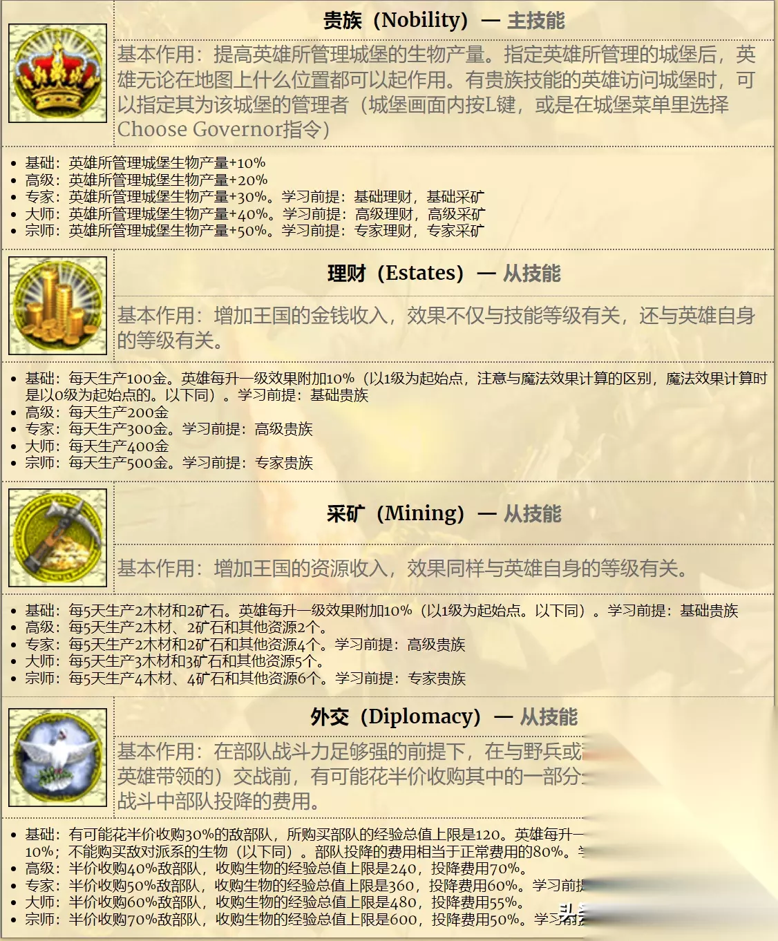 贵族系的技能,则同样对应了3代里的所有资源类型技能。包括可以提升生物产量的贵族技能、提升货币产出、资源产出的理财和采矿技能,以及提升购买敌方部队的外交技能。虽然看起来都挺好用,可是也对英雄属性的提升毫无帮助。