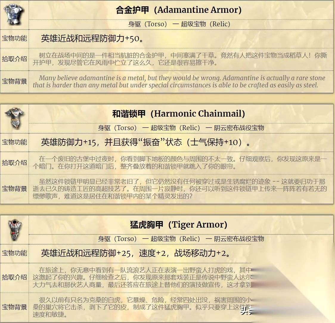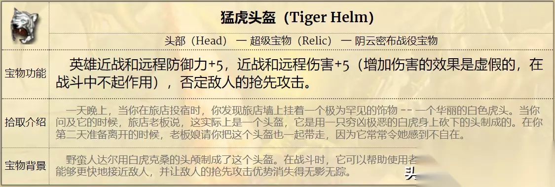 比如猛虎头盔,可以直接给穿戴者增加5点近战防御和5点远程防御,还能增强5点物理伤害(BUG无效)。