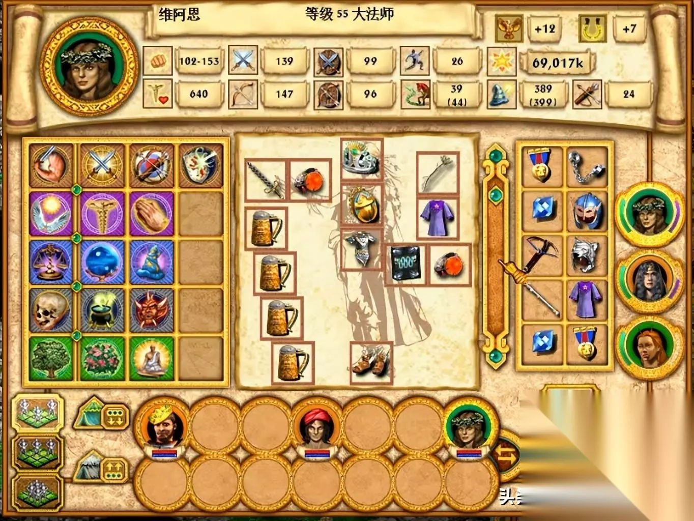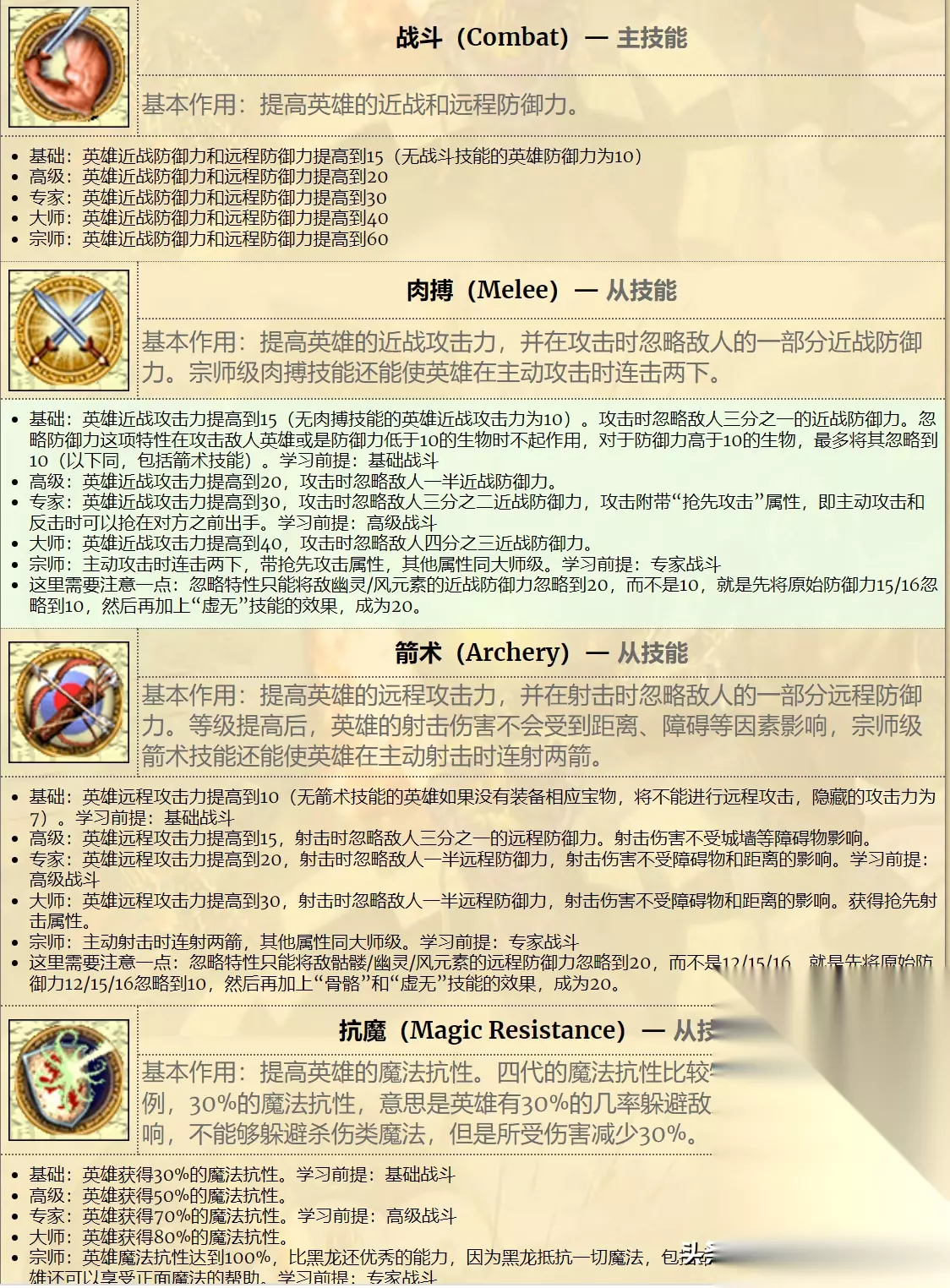在战斗系技能里,主技能战斗提升的主要是防御力,极限情况下,可以将英雄的双防提升到60点。 而三个从技能里,肉搏可以提升英雄的近战攻击,拉到40点至于还给应i下哦那个提供了抢先攻击和两次攻击的效果。 箭术则是将英雄的远程攻击拉到30点,两次攻击、忽视对方一半防御以及不受障碍和距离影响。 最后的抗魔更厉害,达到宗师级别后,可以直接让英雄的魔法抗性拉满到100%,即不吃一切有害魔法,但是可以接受我方祝福魔法加强。 战斗系的效果最终有多强呢?如果我们把一个英雄升到40级以上,再加上点满所有战斗相关的技能。则可以得到如下这样的英雄(不带宝物)。