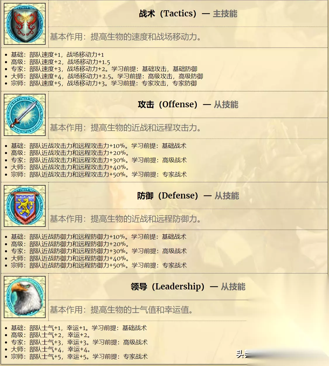 比如战术系的技能,全系都是增加部队强度的。主技能战术,最高可以增加部队5速度和3的战场移动力。而攻击、防御技能,最高分别可以增加部队50%的攻击力与50%的防御力,领导术则可以增加部队5点士气和5点幸运。 虽然增幅不少,但是这个属性的增加主要是针对部队,对英雄本身并没有什么加成效果。