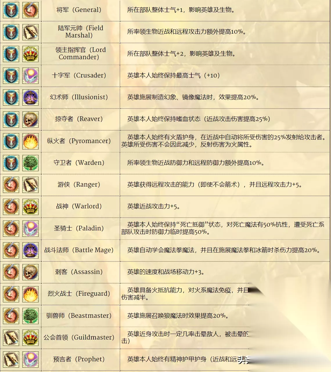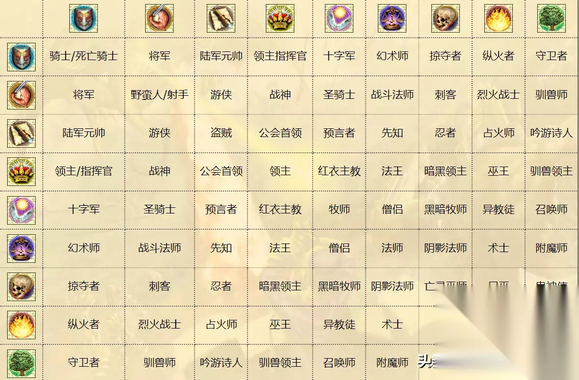 1个40级的不带宝物英雄,基本上可以达到80~120的伤害,500点左右的生命,40的近战攻击,30的远程攻击,双60的防御能力和6的战场速度。 单看属性,此时的英雄已经强于一只普通的黑龙了,如果再算上技能效果。那么此时的英雄单挑3~5只黑龙也是有可能获胜的。 不过光是这样还不够,能够对于英雄有所增强的维度还有两个,那就是职业和宝物。 2 英雄的职业增幅: 当我们的英雄,掌握不同技能体系达到一定程度后,就可以进行职业的转化。 职业本身也分为基础职业和进阶职业两种。 前者一共有11种,分别对应不同阵营的英雄初始技能。