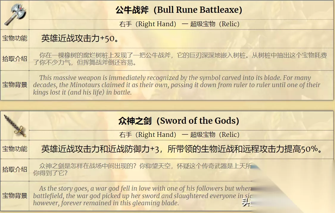 4代英雄可以穿戴的宝物数量,和3代基本类似。头部、项链、身体、左手、右手、远程、肩膀、指环、足和4个杂物框。 而能穿戴的宝物,也分为了道具(Item)、财宝(Treasure)、二流宝物(Minor)、一流宝物(Major)和神器(Relic)这五个等级。 其中道具基本上是一次性消耗品,所以实际的宝物等级,还是财宝、二流、一流和神器这四个档次。 而在神奇级别宝物里,也有若干件,是可以大幅增强英雄单体作战能力的。