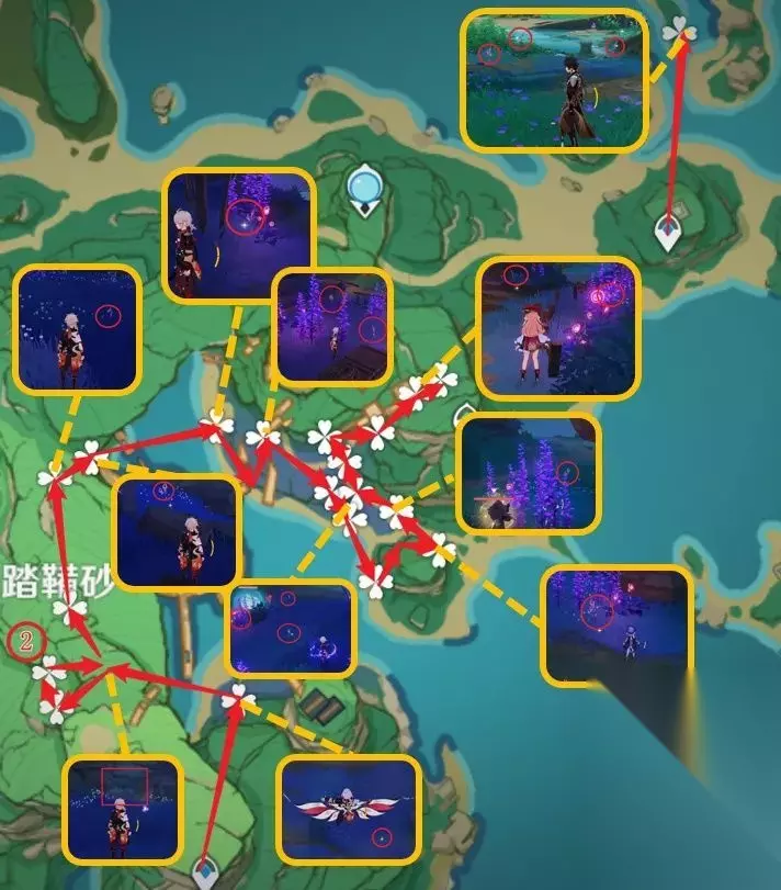 ▲ 跑图推荐 全材料总体力消耗预估: 7970~9390(33天~39天) 鸣草采集 鸣草大多生长于受雷元素影响的地区,不少地区被祟神意志污染,其中踏鞴砂需完成《踏鞴物语》才能解除污染,否则会对范围内角色持续造成伤害。携带芭芭拉可极高提升跑图体验。 图中四叶草标符为鸣草点位,红圈内数字为对应点为高收益点鸣草数。 由于部分鸣草采集较为繁琐(涉及高度差),预览图或许无法满足良好食用效果,推荐搭配采集视频一同食用。 采集路线 线路耗时:7~10分钟 线路总收益:鸣草×51 1、踏鞴砂