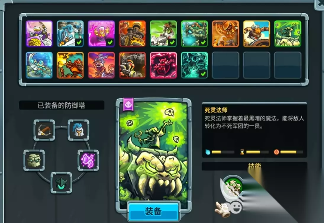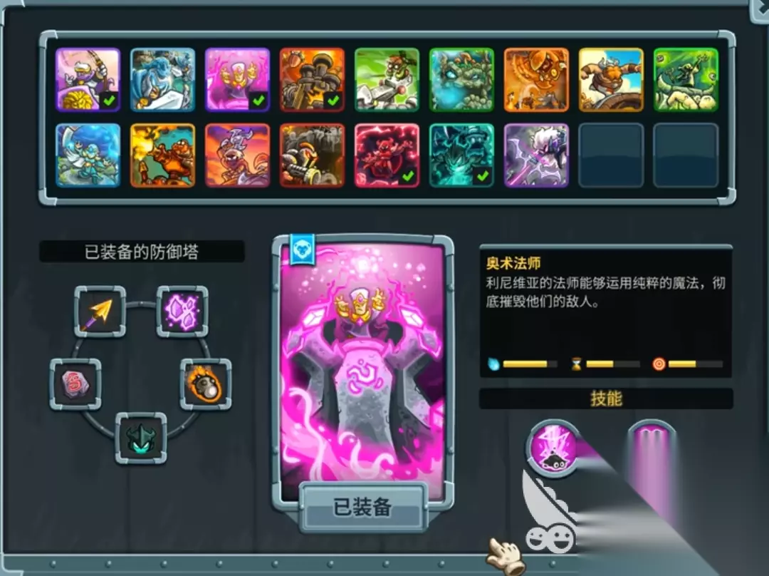 以其极高的性价比和战术灵活性紧随其后。这座造价300金币的魔法塔拥有游戏中最强的单体爆发能力,一技能可瞬间消灭高血量精英敌人,二技能则能为周围防御塔提供20%伤害加成,极大增强团队输出。奥术法师塔特别适合放置在关键路径的拐角处,既能最大化单体技能的利用率,又能辐射更多友军享受增益效果。测试表明,在配合三座基础箭塔的情况下,奥术法师塔的增益效果可使团队总输出提升约35%。其缺点是范围伤害能力较弱,需要搭配群攻型防御塔弥补这一不足。 死灵法师塔