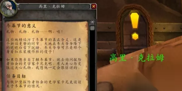 【2024冬幕节活动攻略大全】 冬幕节的意义任务怎么做 联盟: 1、联盟玩家需要前往铁炉堡的平民区,在坐标(30.5,69.3)的位置,找到一个叫做高里·克拉姆的npc的接受任务。