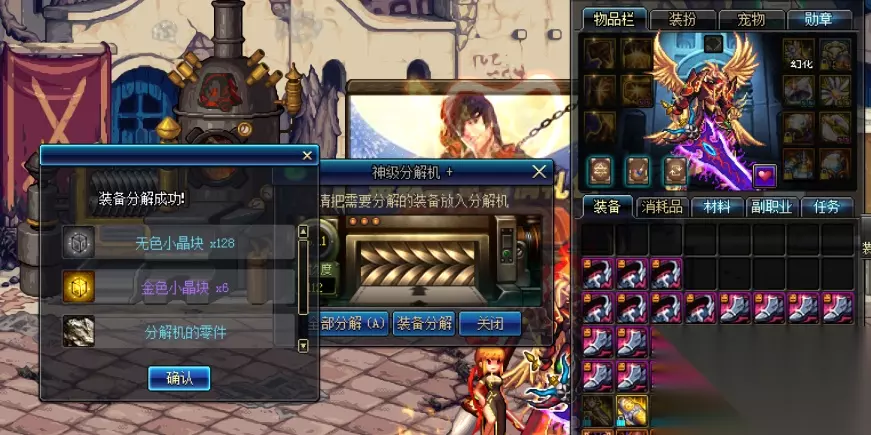 用NPC分解机时:分解1件圣物装备不暴击情况下,保底16上级元素结晶,无色小晶块114个,其分解材料上架拍卖行可获得16000金币左右; 在暴击的情况下,可获得494个上级元素结晶,无色114个,总获金币为110000金币左右; 如果用自己的11级分解机的话,其收益数据相差不大,不同点就是自己分解机可以分解圣物时有几率出金色小晶块,以及产出的无色小晶块比NPC分解机多14个。