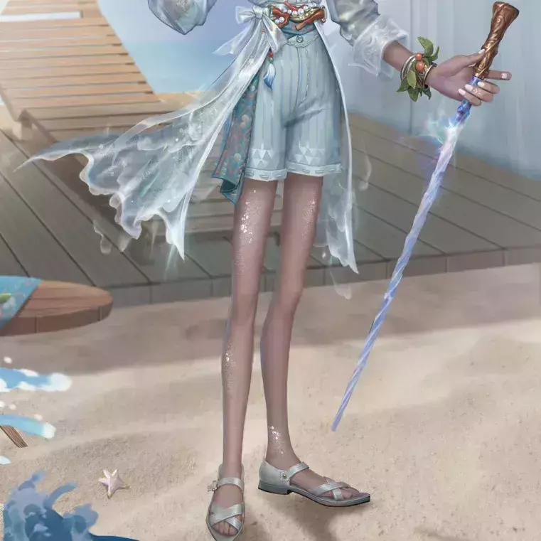 层叠的海浪在他半透的外套上流动,轻便的凉鞋适宜夏日的出行,手中的绅士杖以剔透的材质打造,渐变的湛蓝如大海般深邃。