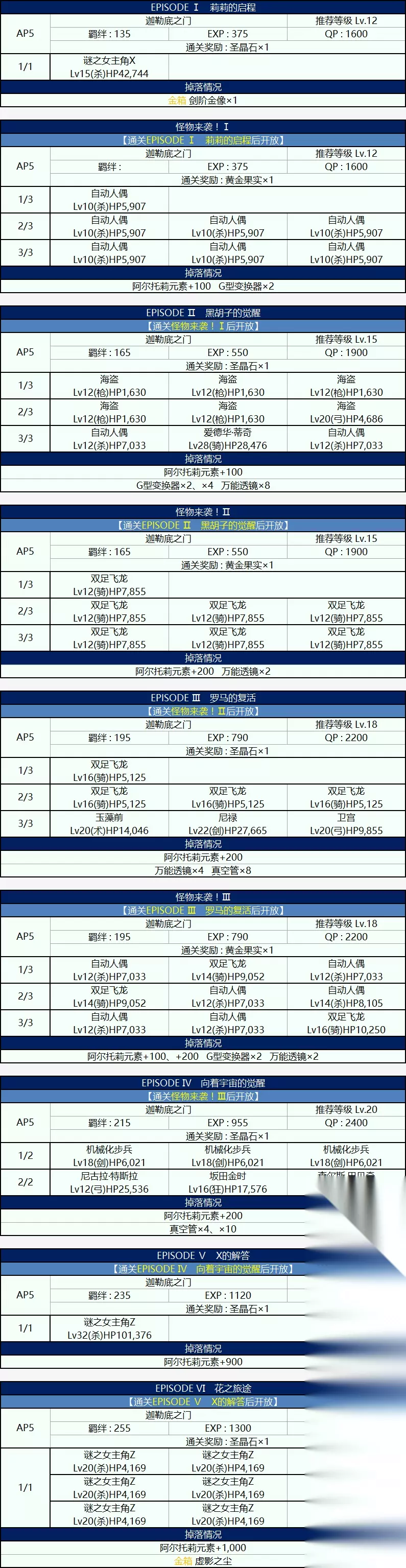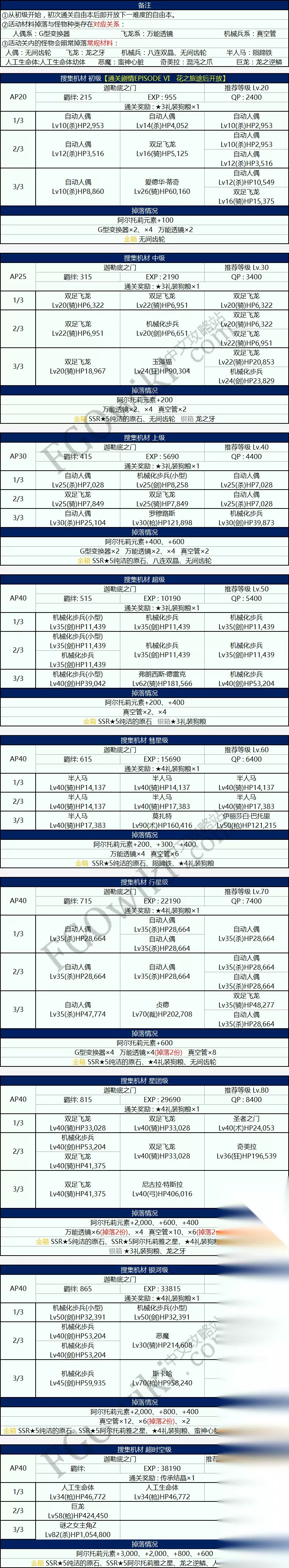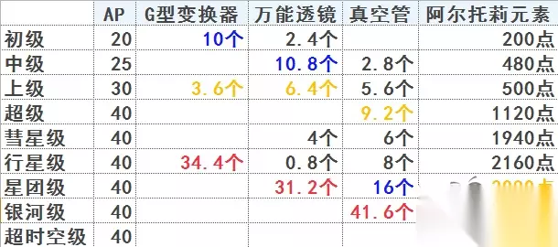 由于本次活动,剑阶的从者都有一定的伤害加成,因此在对阵非弓阶敌人时,都推荐选择剑阶从者。 行星级是掉落道具『G型变换器』最多的副本。 除了关底boss『贞德』之外,其余敌人都为杀阶或骑阶,并且血量较低。而『贞德』虽然为裁决阶,有非狂阶或裁决阶伤害减半的特性,但由于本次活动中,剑阶从者都有较高的攻击力加成,并且『贞德』的宝具没有伤害,因此20万血的『贞德』并不难对付。 星团级副本是掉落道具『万能透镜』最多的副本。 在第四节的计算中,它也是想要兑换完全部物品的玩家需要攻略次数最多的副本。星团级副本的敌人以骑阶飞龙为主,不足为惧。第二关有一只近20万血的狂阶奇美拉,需要优先打倒。对于一般玩家来说,关底boss『特斯拉』应该是极大的麻烦。不但为弓阶,克制本次活动的主力剑阶从者,而且血量也有40万之多。身为弓阶从者,不但宝具充能条只有3格,1技能还可以进行额外充能。2技能则是会赋予自身毅力状态,并且大几率提升防御力3回合,而他的光炮型宝具则有灭团的能力,可以说异常难缠。没有自信的玩家在攻略这个副本时,可以选择使用带了『SSR★5纯洁绽放』礼装的枪阶从者进行克制。当然这样会损失一些点数的加成。如果自身拥有『SSR★5谜之女主角X』,再加上好友的『SSR★5谜之女主角X』,应该能较为轻松地过关。对自己比较自信的玩家也可以使用好友的『SSR★5谜之女主角X』与自己的两位剑阶从者进行战斗。需要注意的是,尽量使得『SSR★5谜之女主角X』等np获取能力较强的从者在面对『特斯拉』之前多攒np,争取在面对『特斯拉』时可以放出宝具。 实际上,在玩家的活动礼装数量较少的时候,『特斯拉』的确是非常麻烦的从者。但在活动中后期玩家有了较多的活动礼装后,即使只使用剑阶从者,也可以逆克制来对付『特斯拉』。因此,为了开启后面的银河级副本,玩家第一次面对『特斯拉』时,选择非点数加成的阵容保证通过也是无可厚非的。 银河级副本是掉落道具『真空管』最多的副本。 虽然推荐等级比星团级副本要高,但由于第二关的20万血恶魔是骑阶,被『SSR★5谜之女主角X』克制,而第三关近100万血的boss『斯卡哈』则是被全部剑阶从者克制,因此这一关的总体难度比星团级要容易得多。玩家只需要在第三关集中精力优先击杀『斯卡哈』即可。 最后的超时空级副本是掉落点数『阿尔托莉元素』最多的副本。 虽然是这个活动推荐等级最高的副本,但由于最具有威胁性的第二关的巨龙是枪阶,被剑阶克制,所以唯一的难点就是第三关血量高达100万的『谜之女主角Z』了。由于第三关只有一个敌人,因此敌方的『谜之女主角Z』1回合3动。因为是杀阶,所以宝具充能条也只有3格,好在没有充能技能,因此玩家至少有4回合的时间来击杀她。需要注意的是『谜之女主角Z』的技能『支援炮击』能在1回合后对敌方全体赋予中概率晕眩状态,运气不好就会少一个输出回合。如果对自己没有自信,可以等有了多张活动礼装『SSR★5阿尔托莉雅之星』之后再来进行挑战。纯为通关的玩家,也可以使用术阶从者进行克制。