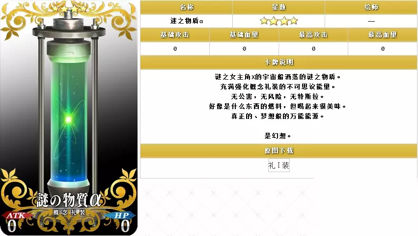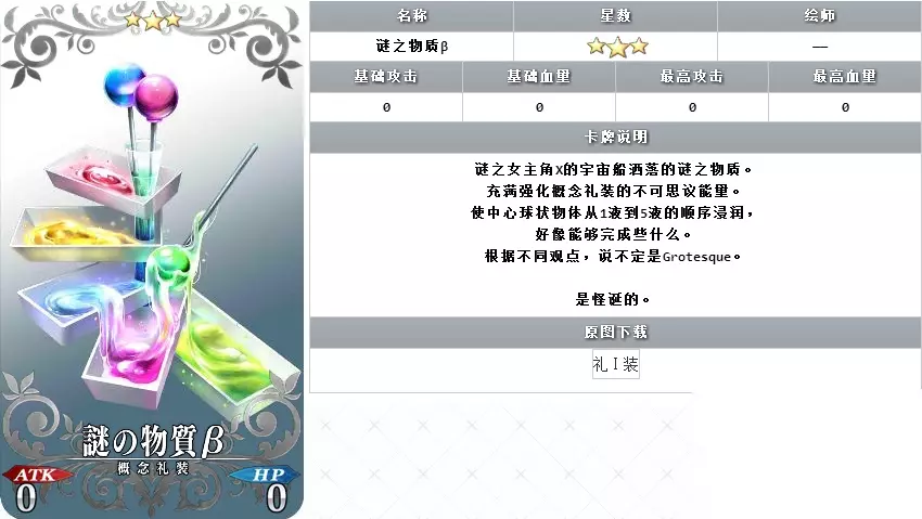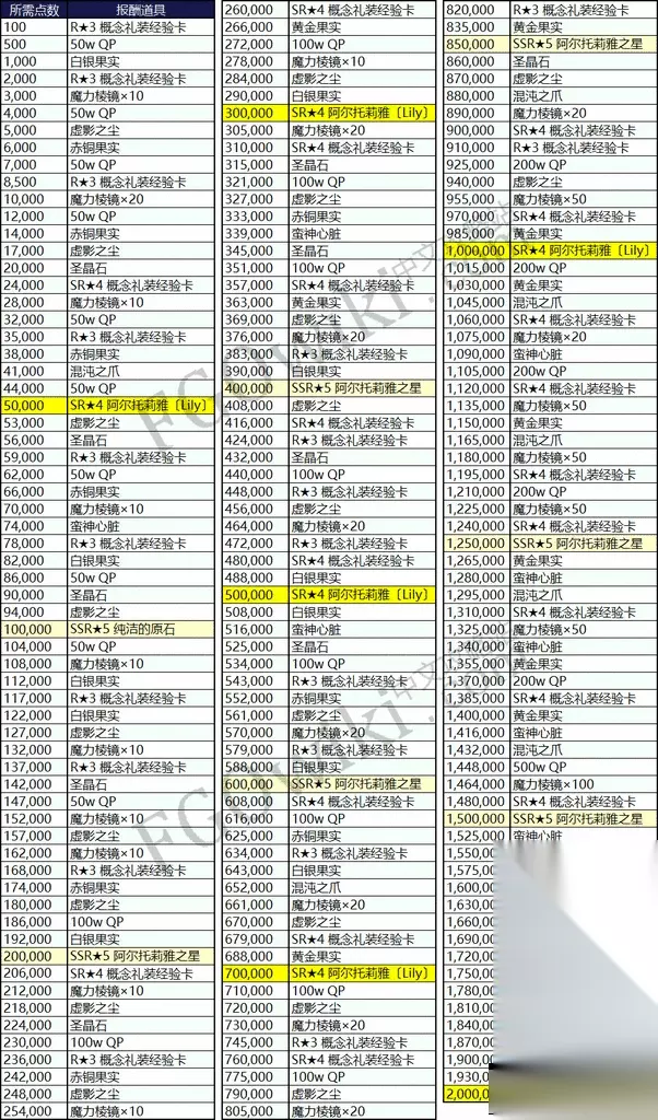 ★3概念礼装EXP卡:迷之物质β 提供礼装经验值18000点 ★4概念礼装EXP卡:迷之物质α 提供礼装经验值30000点 从表中可以看出,获得满宝具『SR★4阿尔托莉雅·潘德拉贡〔Lily〕』所需要的点数为100万,而获得所有奖励所需要的点数为200万。相比较本能寺活动而言,点数的需求量增加了,而点数的加成却减少了。