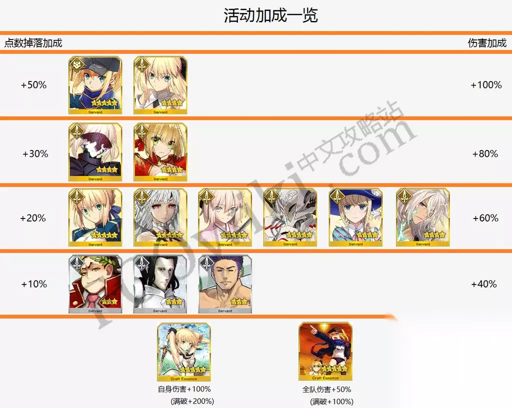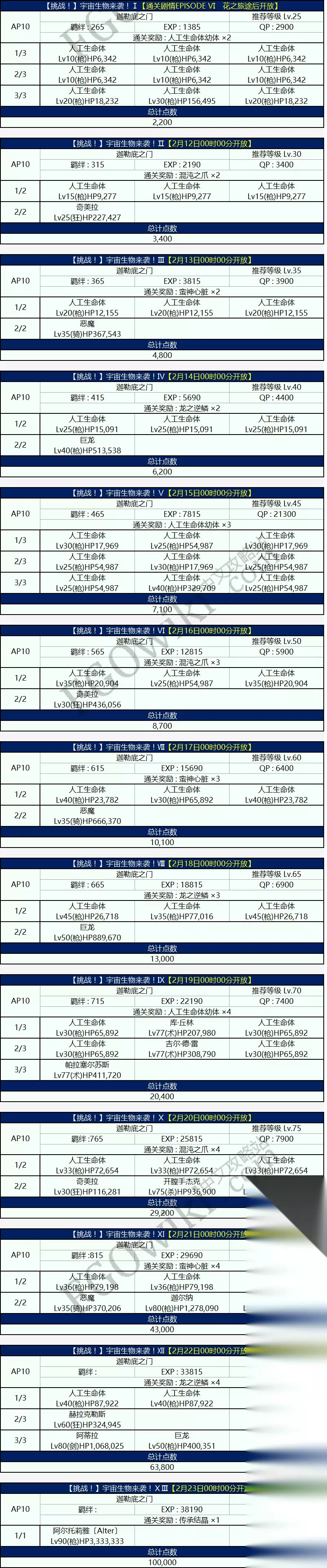 『【挑战!】宇宙生物来袭!』类副本,在通关全剧情后解锁,一天更新一个,一共13个。 与本能寺的黄金天国副本所不同的是,此类副本不但通关后会有一些材料作为奖励,副本中的敌人也会掉落稀有材料,但有些副本难度不低。 由于前面几个副本的敌人血量不高,或者多为枪阶与骑阶,被玩家的剑阶从者与『SSR★5谜之女主角X』克制,因此难度较低。 第九个副本每一关都有一位术阶从者,对『SSR★5谜之女主角X』不利,可以选择使用全剑阶从者进行对抗。 第十个副本的关底boss为约94万血量的『开膛手杰克』,攻略方式与超时空级副本类似。自信不足的玩家可以等加成礼装数量较多之后再来进行挑战。 第十一个副本的敌人都为枪阶与骑阶。关底boss为『迦尔纳』,使用剑阶从者与『SSR★5谜之女主角X』也较容易攻略。 第十二个副本的敌人,关底boss为100万血量的『阿蒂拉』,攻略方式依旧与第十个副本类似。关底另一个敌人,40万血量的枪阶巨龙,使用剑阶光炮应该可以顺便击倒。 第十三个副本只有一个敌人,血量高达333万的枪阶从者『阿尔托莉雅·潘德拉贡〔Alter〕』(黑枪呆)。虽然血量高到不可思议,但好在是枪阶从者,用剑阶从者去攻略吧。 总体而言,saberwars活动的副本攻略方法,基本就是在加成尽量高的情况下,考虑上不上『SSR★5谜之女主角X』。如果关卡敌人的阵容是纯枪阶或者多术阶,那就不用上。如果是多骑阶或者有弓阶boss,那就上。如果打不过就等礼装多了再来挑战。因此,实际上具体的攻略方式能说的不太多。准备抽『SSR★5谜之女主角X』的玩家需要提前准备种火与灵基再临素材。没有2张以上五星剑阶从者,或者『SS★4尼禄·克劳狄乌斯』、剑阶的『SR★4阿尔托莉雅·潘德拉贡〔Alter〕』的话,推荐培养『SR★4阿尔托莉雅·潘德拉贡〔Lily〕』。如果有2张以上上述从者,则将『SR★4阿尔托莉雅·潘德拉贡〔Lily〕』放在替补即可。不准备抽或者没抽到『SSR★5谜之女主角X』的玩家推荐提前寻找有她的好友。 七、推荐攻略方式(重要) 下面叙述的是,按照第四部分与第五部分的资料,对想要兑换完全部物品的一般玩家来说,花费最少体力兑换完全部活动道具与获得全部点数奖励的攻略方式。 事前准备: 确保拥有2名以上满破的金卡剑阶从者(没有的话用『R★3盖乌斯·尤利乌斯·恺撒』、『SR★4阿尔托莉雅·潘德拉贡〔Lily〕』或可使其满级满破的材料来替代)。想要抽取『SSR★5谜之女主角X』的玩家还需要准备对应的满破满级材料。 活动开始后: 由于兑换完全部活动物品之后,还差约12万点数才能获得全部点数奖励物品。因此在活动开始时,玩家就应该选择点数加成最高的队伍进行攻略。由于活动限定礼装不加成活动道具掉落,因此支援好友的礼装应该为对应道具的加成礼装。若关卡中有复数种道具掉落,推荐携带掉落堆数最多的道具的加成礼装。后面对此不再赘述。 例如,在『怪物来袭! I』副本中,应该选择携带有加成『G型变换器』掉落的礼装『正射必中』的支援从者。而在『EPISODE Ⅳ向着宇宙的觉醒』中,就应该选择携带有加成『真空管』掉落的礼装『化为红莲的影之国』的支援从者。 具体攻略步骤为: 1,通关全部『剧情副本』与『怪物来袭』副本。 2,从『搜集机材 初级』开始攻略『挑战副本』,直到『搜集机材 行星级』。 3,持续攻略『搜集机材 行星级』副本直到拥有150个『G型变换器』,用来兑换活动礼装『SSR★5纯洁绽放』,并且给队伍主力从者装备。 4,通关『搜集机材 星团级』副本。感觉有难度的玩家可以选择使用一名枪阶从者替换剑阶从者等。之后通关『搜集机材 银河级』副本。 5,持续攻略『搜集机材 银河级』副本直到拥有150个『真空管』,用来兑换活动礼装『SSR★5纯洁绽放』,并且给队伍另一名主力从者装备。 6,若队伍中有三名金卡剑阶从者或者拥有『SSR★5谜之女主角X』,则还需要继续攻略『搜集机材 银河级』副本直到再次拥有150个『真空管』,用来兑换第三张活动礼装『SSR★5纯洁绽放』。没有则可跳过这一步。 7,查表可得,『搜集机材 行星级』副本掉落全部三种素材,『搜集机材 星团级』副本不掉落『G型变换器』,而『搜集机材 银河级』副本只掉落『真空管』,最后的『搜集机材 超时空级』副本只掉落大量点数。 因此,较好的攻略方式应该为『搜集机材 行星级』→『搜集机材 星团级』→『搜集机材 银河级』→『搜集机材 超时空级』。因此,玩家应该带上全部的点数加成从者与礼装『正射必中』开始攻略『搜集机材 行星级』,直到获得了1800个『G型变换器』为止。(之前兑换礼装消耗了150个) 8,对自己有信心的玩家可以带上全部的点数加成从者与礼装『巫女狐!新娘修炼』开始攻略副本『搜集机材 星团级』。 若没有『SSR★5谜之女主角X』,或者是担心打不过的玩家,可以选择先行攻略『搜集机材 银河级』收集点数,等获得了1张或者更多的礼装『SSR★5阿尔托莉雅之星』后再回头攻略『搜集机材 星团级』。其中,为了不溢出材料,『搜集机材 银河级』的攻略次数应少于20次。 9,在此期间,带上最大的点数加成,优先攻略每天刷新的『挑战』副本。在获得礼装『SSR★5阿尔托莉雅之星』后,优先装备给替补从者。 10,在获得了足够兑换全部物品的道具之后,通过现有点数与未攻略的『挑战』副本,来计算点数缺口,开始攻略『搜