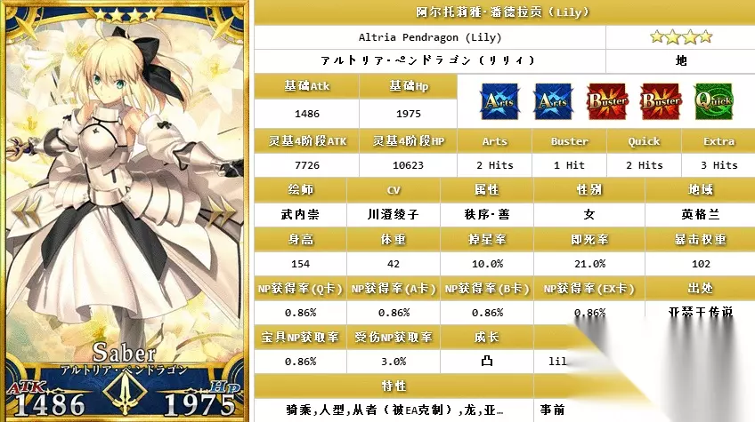 礼装『SSR★5阿尔托莉雅之星』与同类型,并且同为活动礼装的『SSR★5不夜蔷薇』相比,多了10%的弱体耐性,触发毅力后少了999的回血,各有优劣。但总体来说,依旧是一件难堪大用的礼装。想要毅力状态的话,通常情况下会优先选择『SSR★5不夜蔷薇』或者『SR★4死灵魔术』。 虽然这次活动的两件活动限定概念礼装在活动结束后就没什么太大作用了,但在活动期间,『SSR★5纯洁绽放』可以使装备的从者攻击的威力提升100%(满破提升200%),而『SSR★5阿尔托莉雅之星』可以使我方全体从者攻击的威力提升50%(满破提升100%)。因此为了更好地攻略活动,这两件礼装也是需要获得的。(活动中特定从者与特定礼装的攻击威力提升属于特攻类加成) 本次活动中,『SSR★5纯洁绽放』通过兑换与点数奖励一共可以获得5件,『SSR★5阿尔托莉雅之星』通过点数奖励可以获得6件。因此与之前的活动都有所不同,玩家无需担心活动无法满破礼装的问题。 三、活动奖励从者 本次活动的奖励从者自然是:『SR★4阿尔托莉雅·潘德拉贡〔Lily〕』