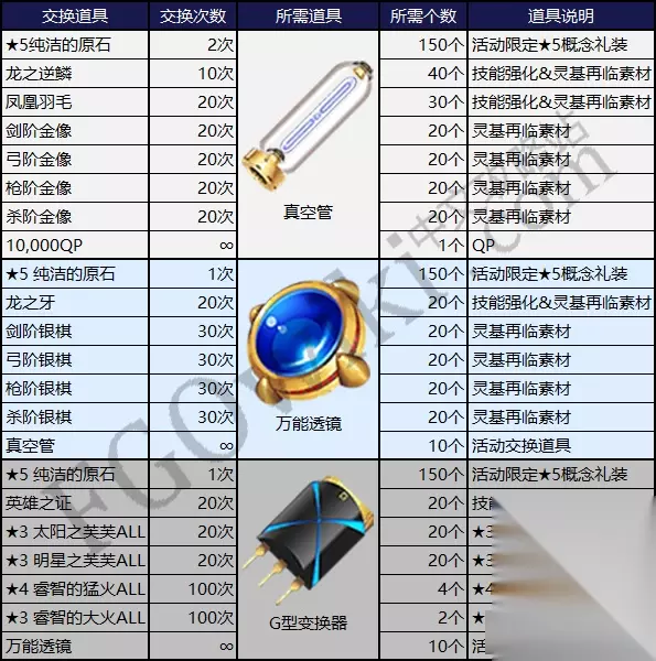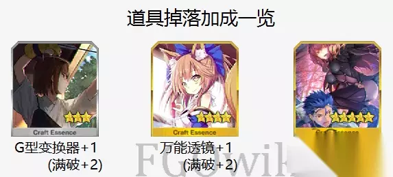 兑换完全部物品所需活动道具数量: 『真空管』:2900 『万能透镜』:2950 『G型变换器』:1950 礼装加成道具掉落: