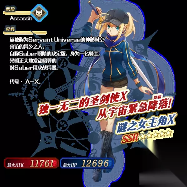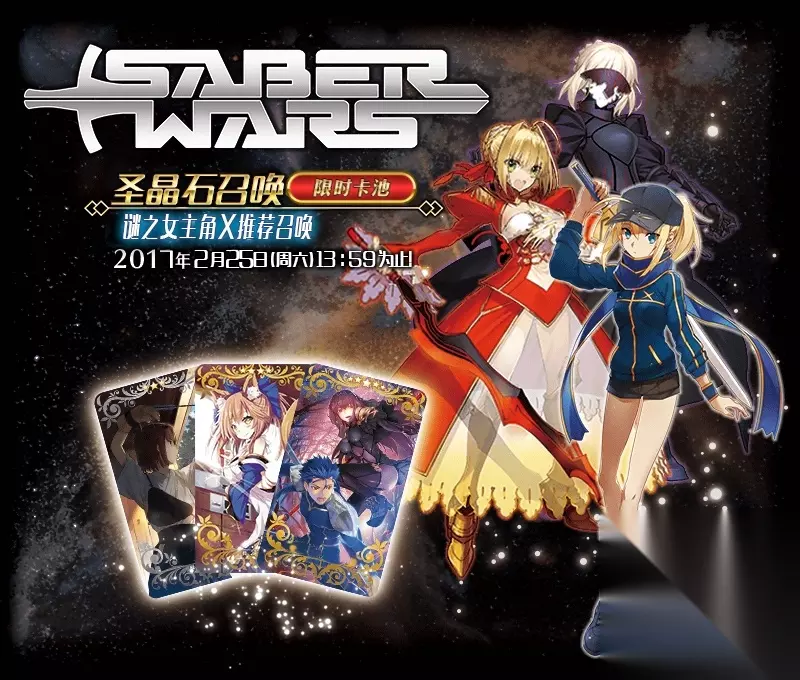 ◆谜之女主角X推荐召唤◆ 时间:2017年2月11日 维护后~ 2017年2月25日 13:59 谜之女主角X推荐召唤卡池限时开启! 从者『★5(SSR)谜之女主角X』初次登场! 此外『★4(SR)尼禄·克劳狄乌斯』,『★4(SR)阿尔托莉雅·潘德拉贡[Alter]』出现概率提升! 对象从者在本次活动关卡中的攻击威力提升!同时会增加阿尔托莉元素的获得量! ※谜之女主角X在本次推荐召唤结束后,将不会加入剧情卡池。 而且,通过装备限时概念礼装『★5(SSR)化为红莲的影之国』, 『★4(SR)巫女狐!新娘修炼』,『★3(R)正射必中』, 可以提升活动道具的获得数量。 推荐召唤期间,新登场从者,活动限定概念礼装, 以及推荐召唤的从者出现概率提升! 10连召唤可至少获得1枚四星以上(含四星)卡牌,以及1骑三星以上(含三星)从者! ※保底的四星卡牌包括从者及概念礼装。 首先分析概率提升的从者。 本次新登场的概率提升的从者为『★5(SSR)谜之女主角X』: