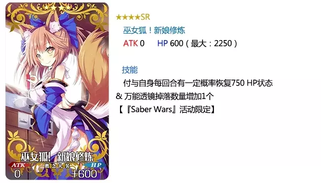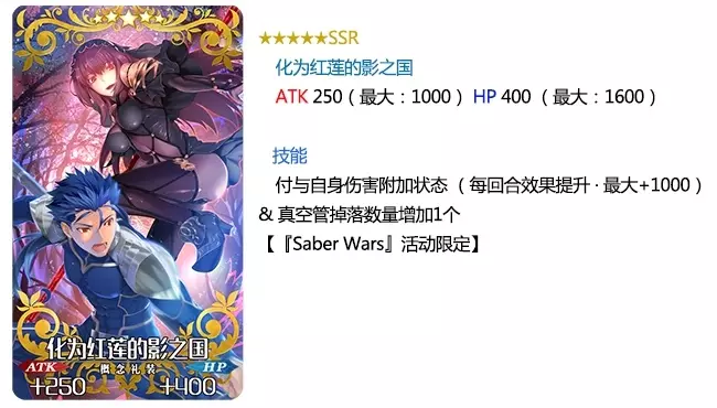 本次活动限定的概念礼装效果也都较为一般。 『★5(SSR)化为红莲的影之国』每回合只加100点伤害,需要10回合才能达到最大值1000点。实用效果基本比不上直接加成色卡的礼装,如『★5(SSR)虚数环』、『★5(SSR)元素转换』、『★5(SSR)限制/零毁』等。 『★4(SR)巫女狐!新娘修炼』每回合有65%的概率回复750HP,相当于每回合回复487.5的HP,不如『★5(SSR)月女神之沐浴』的每回合回复500HP,而后者也几乎无人使用。 『★3(R)正射必中』与『★4(SR)一之太刀』效果类似,都能赋予必中状态。但使用回避的敌人却寥寥无几。这类礼装的副效果也较弱,使用范围极度狭窄。 综上所述,不考虑活动礼装的道具掉落加成,本次卡池的期间限定礼装依旧难堪大用。而由于本次活动的难点是点数,所以礼装加成的用处也不大。因此综合来看,本次卡池并不建议一般的无氪玩家抽取。但对于喜欢『★5(SSR)谜之女主角X』的玩家来说,这是目前为止唯一一次能获得她的卡池了。 九、总结 与同为点数获取与材料获取相辅相成的本能寺活动相比,saberwars活动明显吸取了本能寺活动点数获取过多而材料获取过少的缺点,使得两者较为平衡。还增加了可以兑换的礼装数量,使得所有玩家都能不花费太大代价就可以满破活动礼装,可谓是异常良心。但首创的特定从者伤害加成机制,则使得本次活动的副本攻略方式非常简单。虽然这不能称得上是缺点,但还是希望后续活动可以有1-2个需要玩家合理搭配阵容才能成功攻略的副本。 本次活动的稀有材料无论是掉率,还是通关后赠送的数量,都基本让玩家满意,因此也是一个很不错的活动。虽然本次活动赠送的概念礼装与从者并不强力,但好歹让『阿尔托莉雅·潘德拉贡〔Lily〕』可以满宝具,还是有一定的纪念意义的。 最后,希望玩家可以以本攻略作为参考,合理规划体力,选择最适合自己的攻略方式。