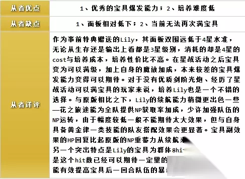 针对国服玩家的简评: 作为事前赠送从者,Lily的性能已经被玩家充分的了解。双围水平在四星中垫底,三个技能中也只有爆发的魔力放出有较大价值,总体而言只有三星水准的战略价值。在本次活动中Lily将能被强化满宝具等级,而Lily满宝具后倍率为600%,相当于光炮从者经过宝具强化本之后的水准。所以略高的宝具倍率弥补了Lily白值劣势,再加上魔力放出的爆发增幅,Lily仅在宝具输出方面有着优秀的表现。 但因为Saber职阶中同类的优秀光炮从者数量太多,在本次活动关卡以外,只要任意入手一位Lily的价值就会大大降低。 需要注意的是,『SR★4阿尔托莉雅·潘德拉贡〔Lily〕』由于在国服300万预约奖励的时候就免费赠送,因此并不能算是活动限定从者。她所需要的灵基再临素材也与普通从者类似,需要玩家自行准备。 『SR★4阿尔托莉雅·潘德拉贡〔Lily〕』在活动中通过积累点数的方式获得,在拥有100万『阿尔托莉元素』时即可获得全部的5张。 由于活动机制,『SR★4阿尔托莉雅·潘德拉贡〔Lily〕』在本次活动中对于一般玩家来说是非常重要的。如果玩家没有两张以上的金卡剑阶从者,可以考虑投入资源进行培养,来应对活动。具体内容会在下面详细说明。 四、材料兑换 首先来看活动道具兑换部分: