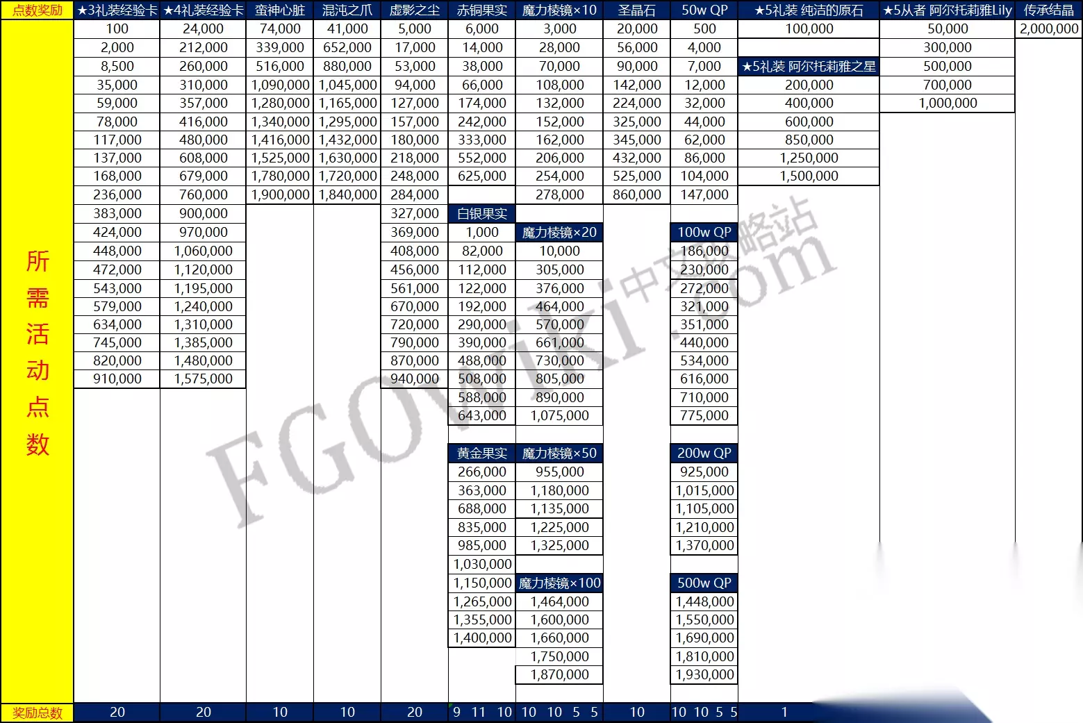 ※注:红色为最高掉率,蓝色为第二高掉率,黄色为第三高掉率。 只有支援好友有对应礼装加成的情况下,大约需要攻略46场行星级;80场星团级;26场银河级。需要ap约为6080点。 满礼装(6件未满破礼装加成)加成的情况下,大约需要攻略24场行星级;46场星团级;24场银河级。需要ap约为3760点。 ※注:上述结果只是粗略计算,因此消耗的体力可能大于计算的体力。 活动持续时间为14天,可回复体力4032点,还需补充约2048点体力。大约需要16管额外体力。使用活动期间赠送的苹果基本可以满足需求(活动期间可以获得的果实数量为13金11银9铜)。 五、点数收集 以下是达到一定点数给予的奖励。获得的道具会直接送到仓库或者发到邮箱。