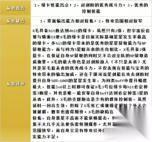 针对国服玩家的简评: 特攻型从者X毛,技能特攻对象是没有克制关系的Saber职阶,宝具的特攻范围则极为狭窄;绿卡出星能力优秀,可惜只有两张,不过二绿二蓝的配卡以及Hit数作用下X毛宝具效率也较为惊人;特攻以外没有增伤手段,只有群体控场的支援炮击较为实用。不考虑人气仅以实用性来看,X毛不是值得专门入手的从者。 并且正好在X毛之前实装了开膛手杰克,两者定位和用法几乎完全重合而杰克远更优秀,导致X毛的位置更加尴尬。 接下来是期间限定的概念礼装: