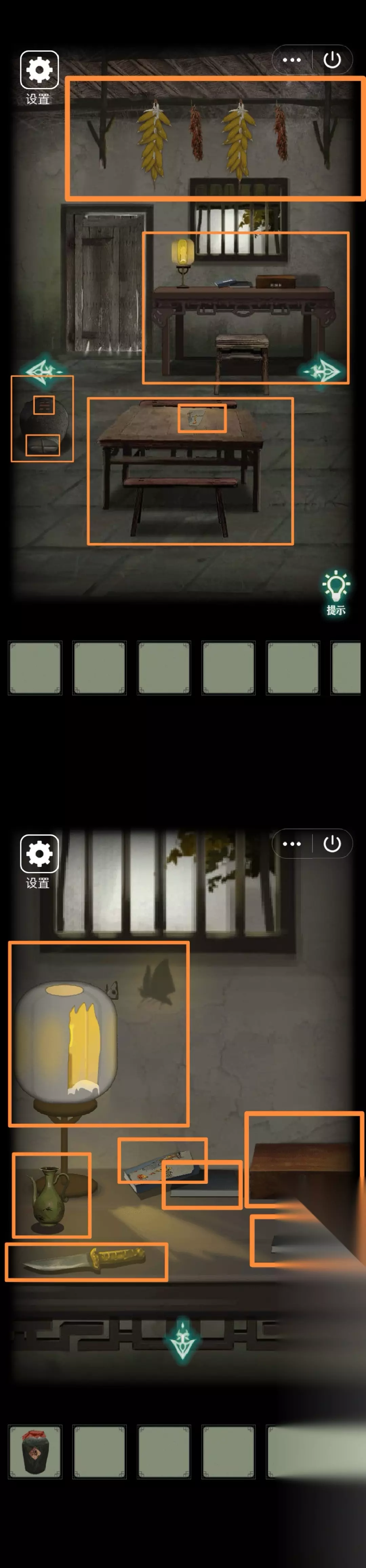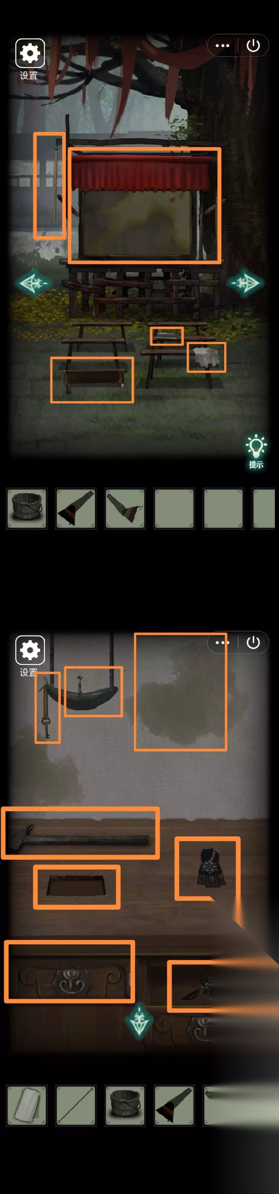 3.右转,地上右边凳子上拾取【干毛巾】、架子上拾取【勾棍】,发现地上左边凳子腿断了需要修补好、右边凳子上皮影戏维护秘籍。点幕布,油灯边拾取【钥匙】、桌上拾取【锤子】。发现左边抽屉需要钥匙开锁、桌上一个凹槽、右边皮影碎片皮影人由头部四肢躯干五块组成(可以把已经收集到的3块皮影碎片先放上去,也可以等全收集齐了再一起放)、吊着的油灯、背后的幕布很脏需要擦干净。打开桌子右边抽屉,得【皮影碎片(三)】。用钥匙开桌子左边抽屉,得【木块】
