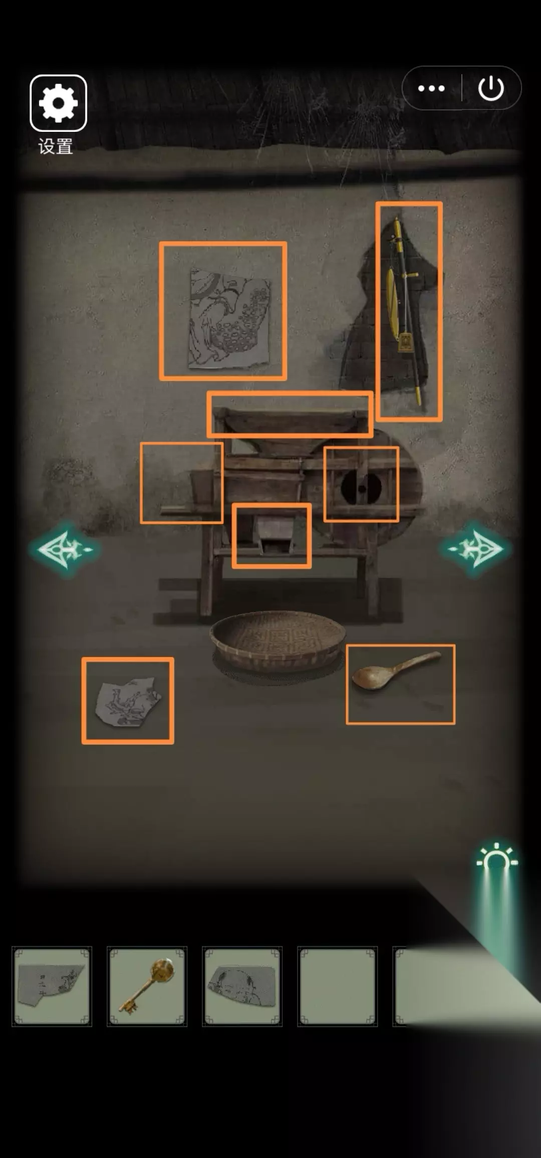36.右转,地上拾取【年画碎片(三)】、【木勺】,发现地上风车的稻谷出口、风车的杂质出口、风车缺转动把手、风车的稻谷存储仓、墙上残缺的年画、残破墙上可以称药材的秤