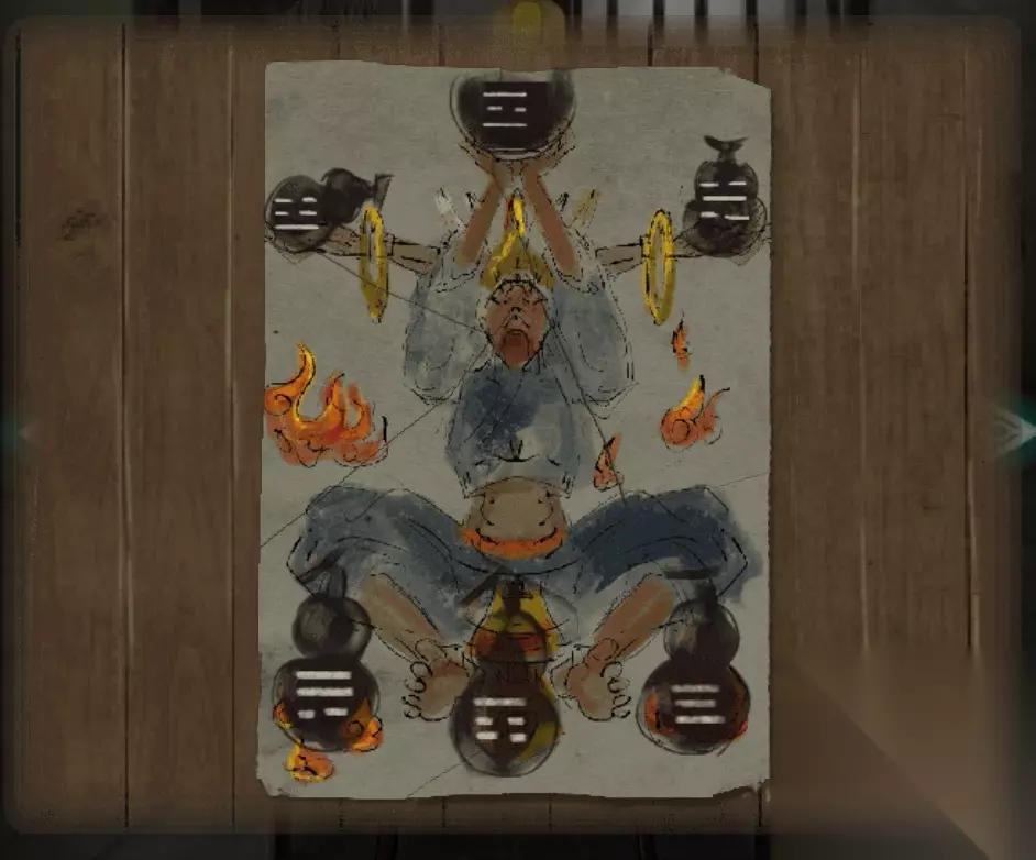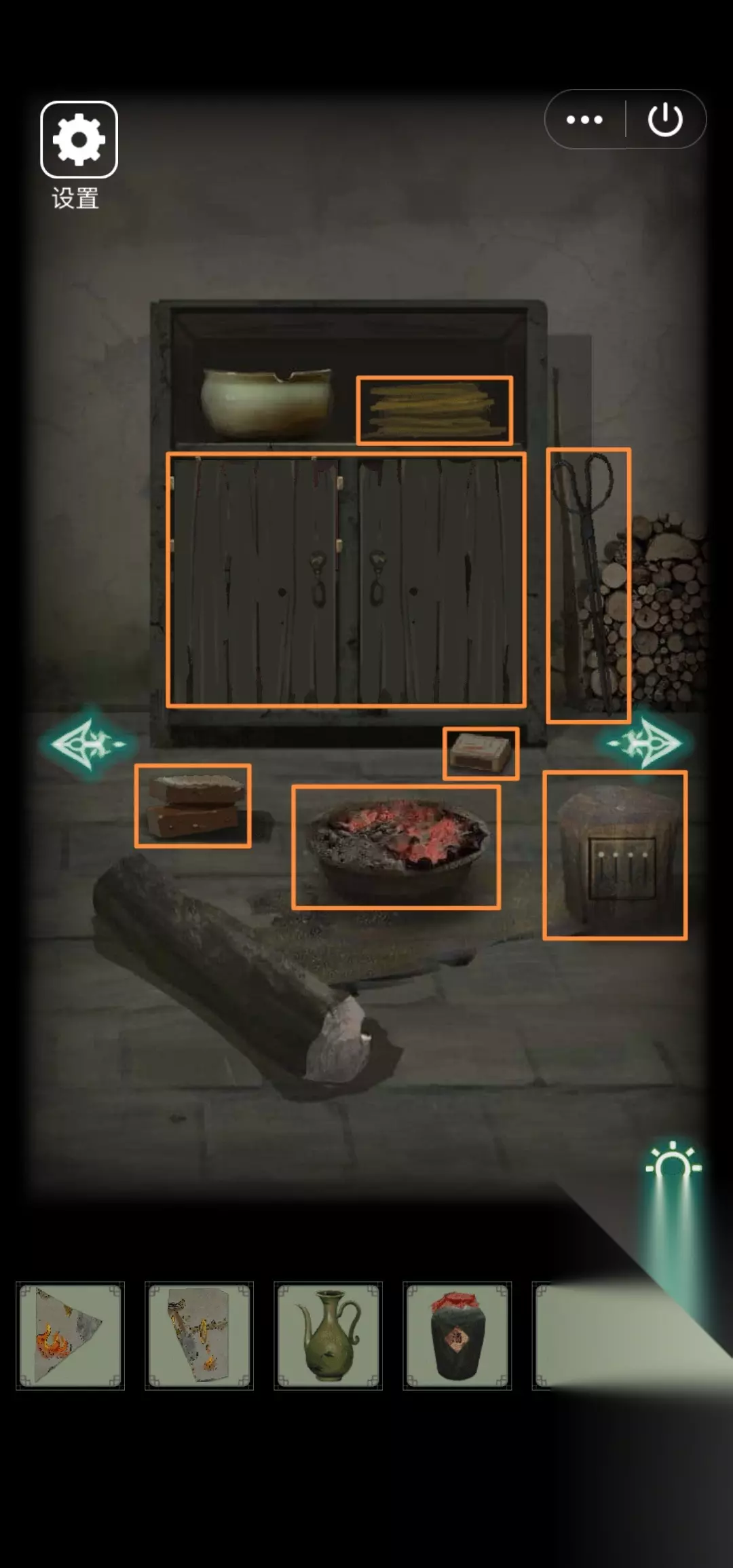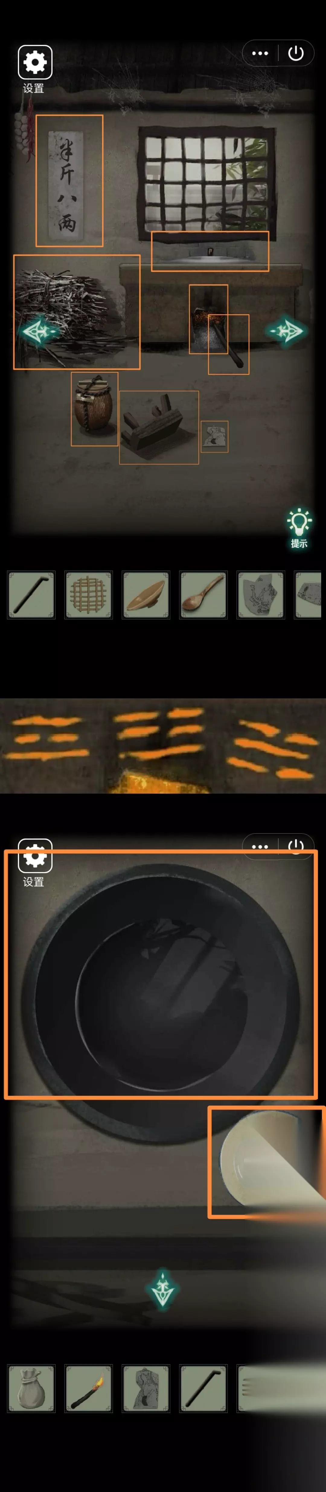 38.右转,墙边拾取【火柴】。发现地上坛子3位八卦符号锁、灶膛边未燃烧的棍子、灶台可以点燃、墙上写着半斤八两的字帖(提示半斤=八两)。移开板凳,得【年画碎片(四)】。把火柴放入灶膛,灶台点燃,得【燃烧的木棍】。从左往右观察灶台3个八卦符号,根据发现的八卦符号开坛子,得【带灰的米】。点灶台上锅盖,拾取【空水碗】,发现锅内一锅清水