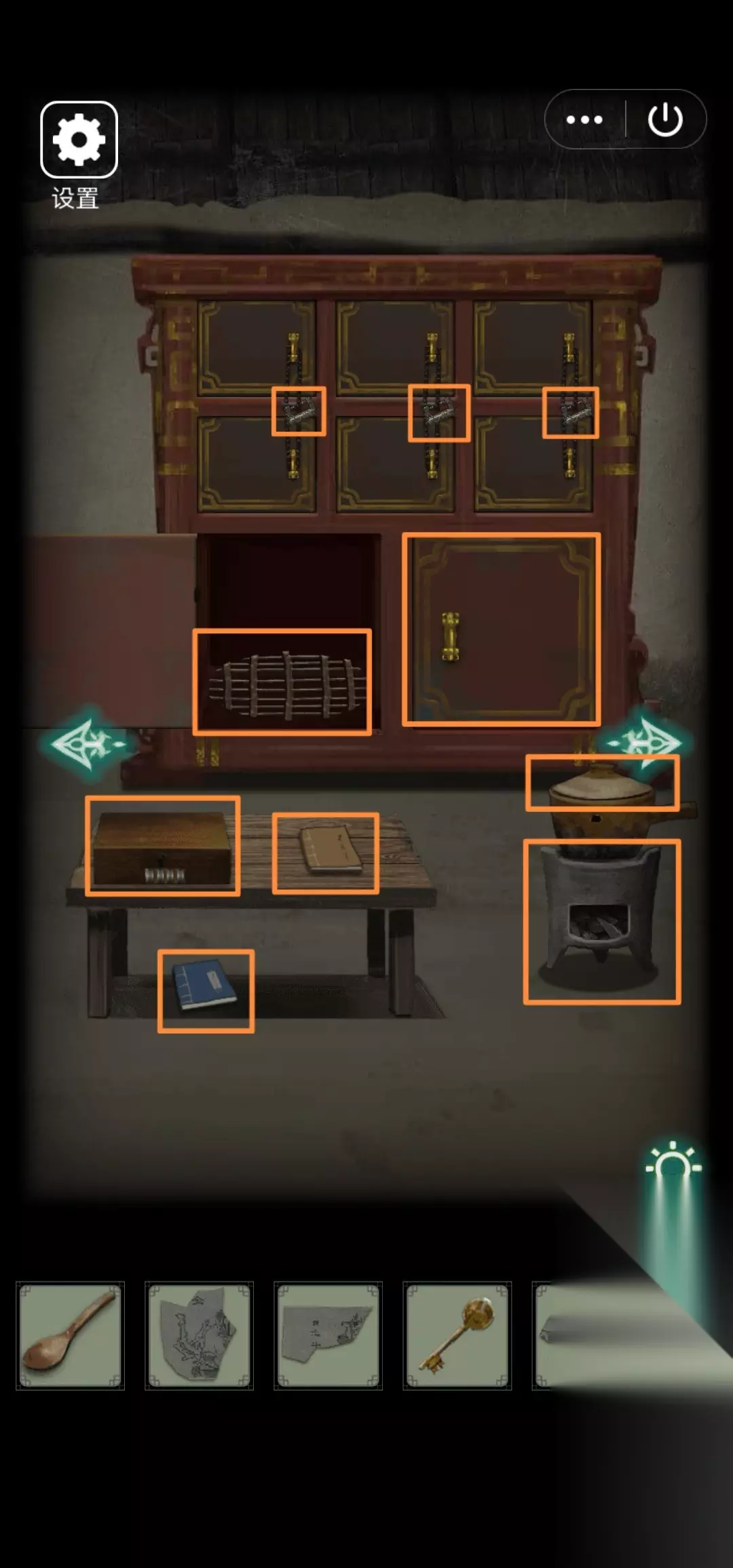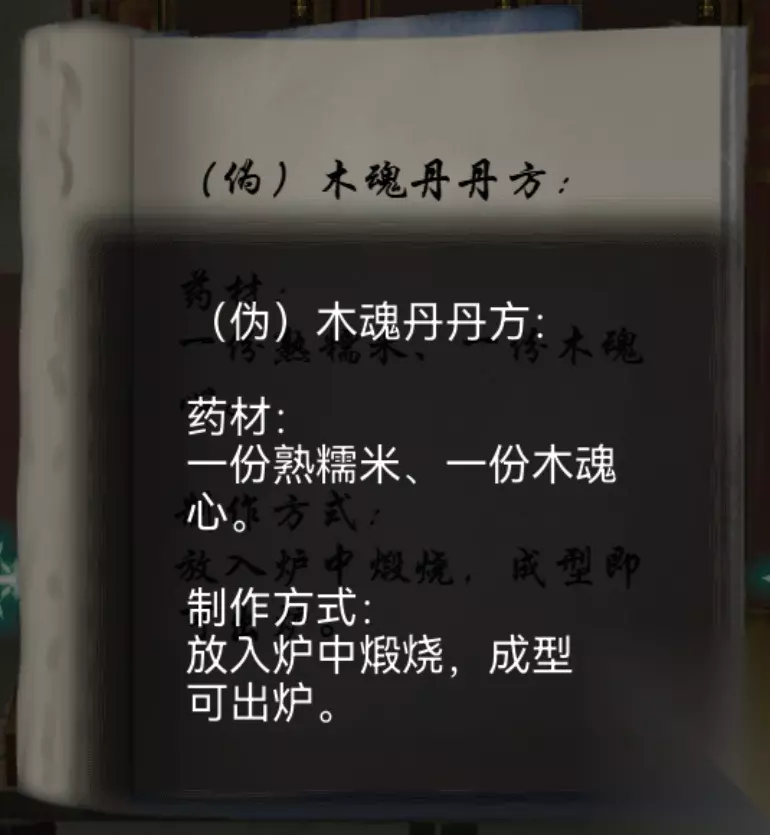 43.左转,点秤,分别称得黄精3两、罗汉果2两、龟甲1两、何首乌4两、玄姜2两、沉香6两 44.左转,根据42发现的重量要求结合43的单重,4个天平分别放上罗汉果、沉香、黄精+龟甲、何首乌+玄姜(一个天平只能放下两个药材,其他组合也行,只要重量符合2646就好),右侧孔洞弹出柱子,得【木魂心】 45.右转,右转,根据37发现的(伪)木魂丹丹方,把熟糯米、木魂心放入药炉,盖上盖子,用燃烧的木棍点燃炉火,得【木魂心(伪)】(等久一点,时间不到只会触发揭开盖子)