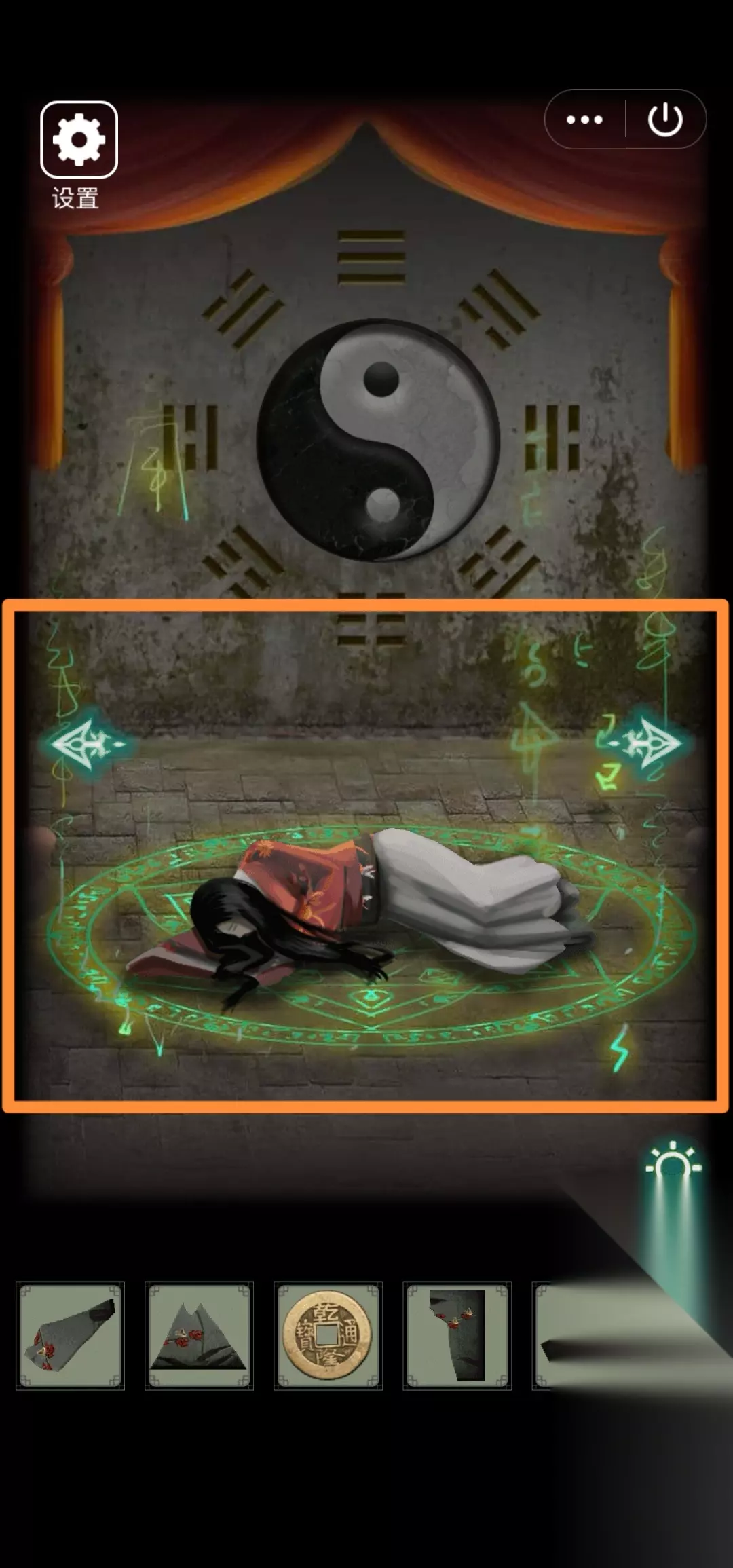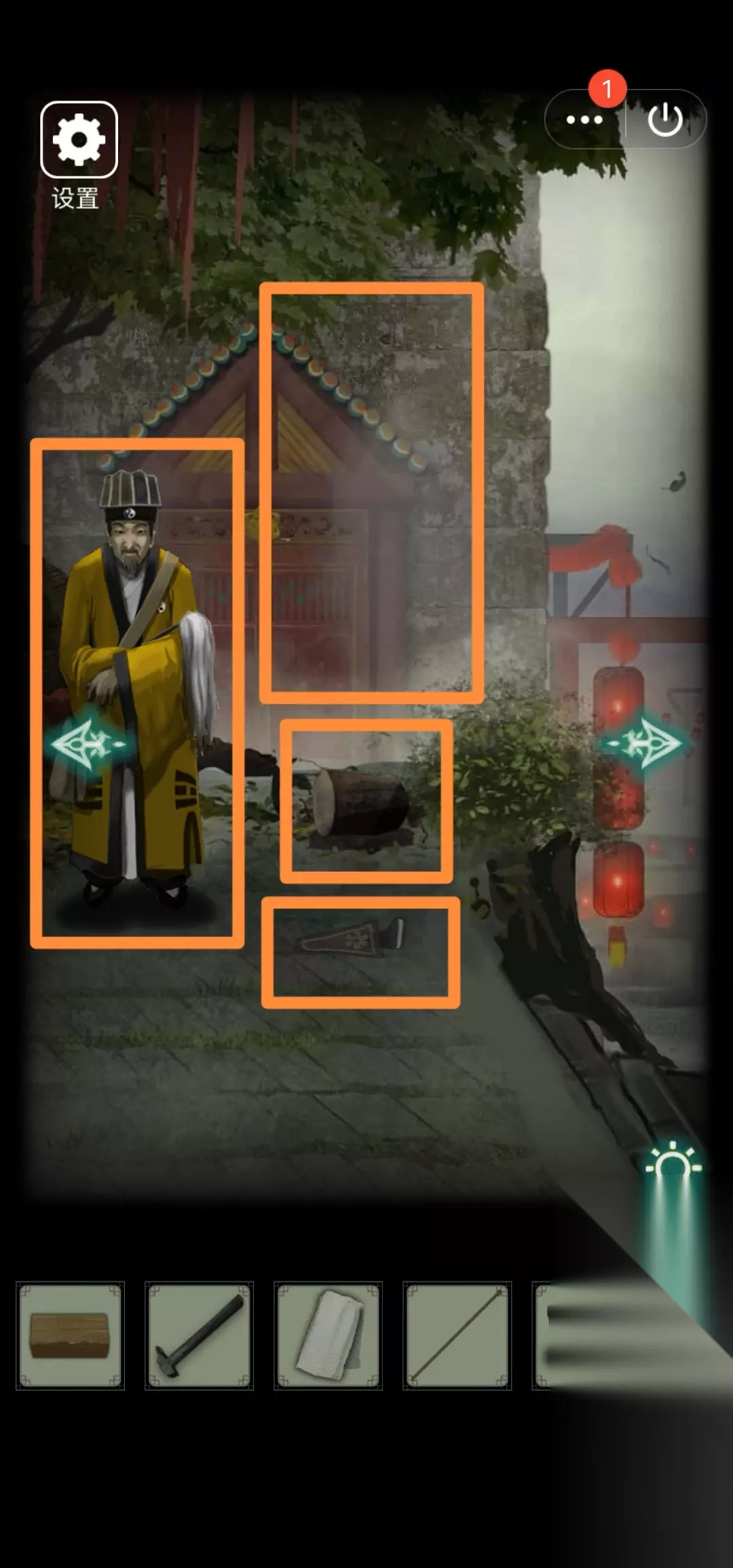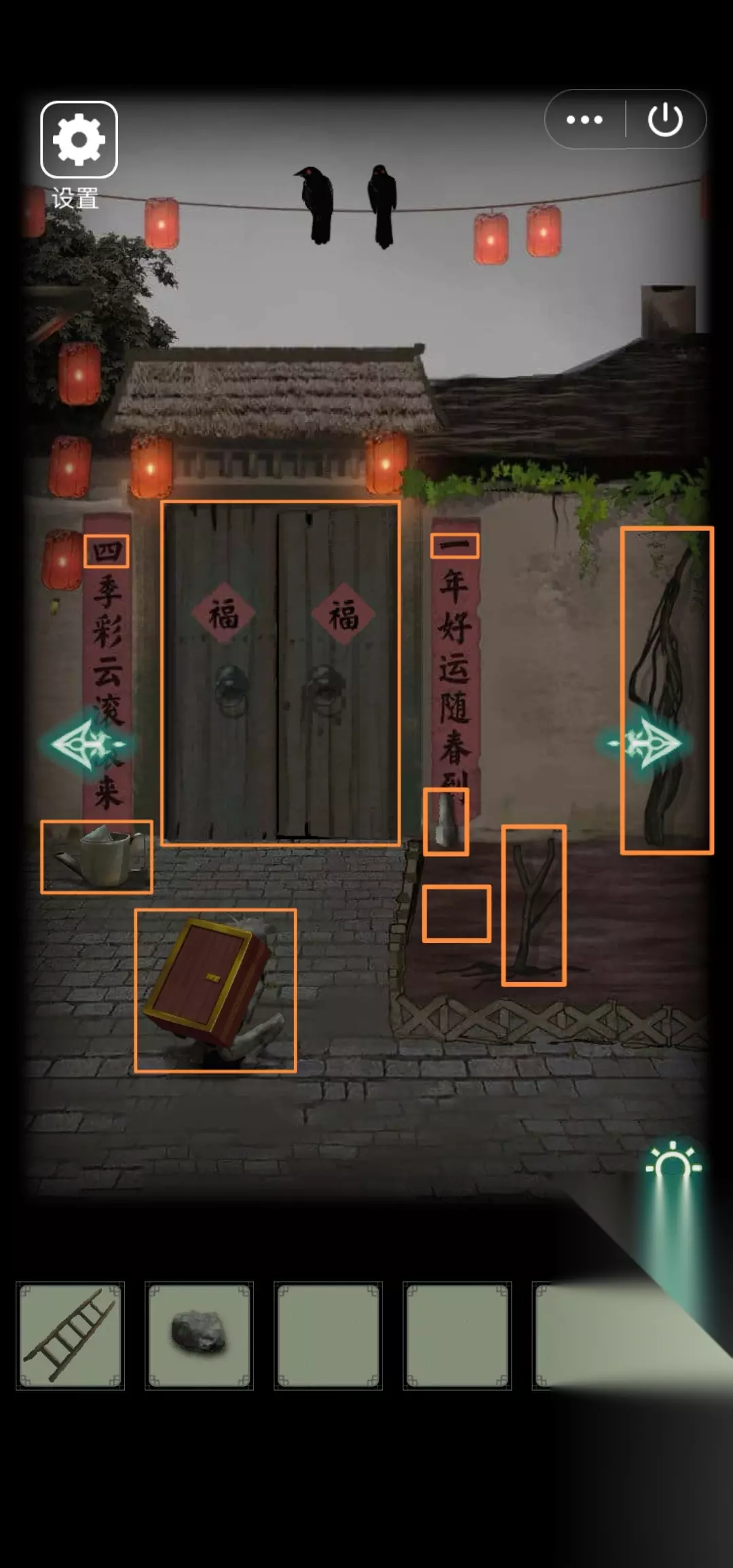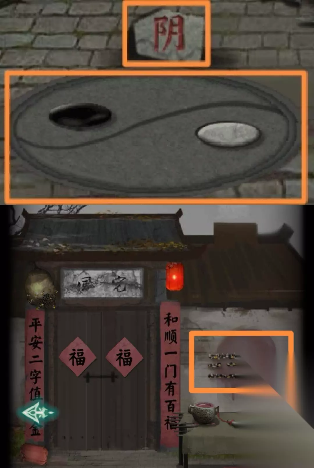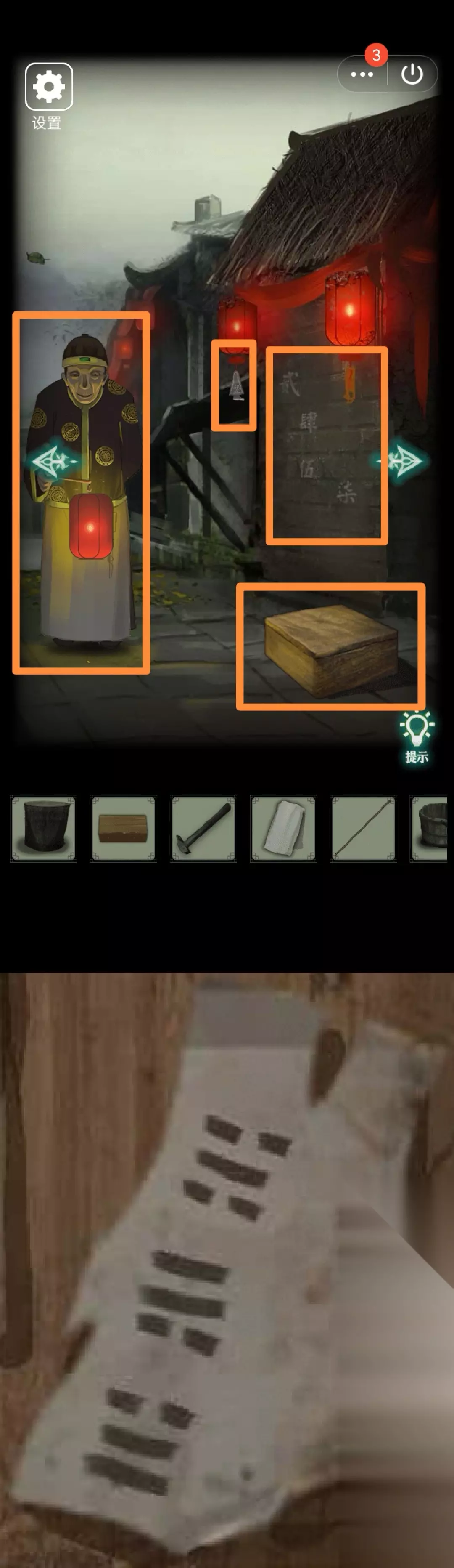 5.右转,从上到下观察墙壁4个大写数字(贰肆伍柒)。发现村长赶我走(这个形象真阴森)戏台坏了需要修、地上盒子3位八卦符号锁、左边灯笼挂着的碎片够不着需要找东西垫脚。根据2发现的八卦符号开盒子,得【凳子腿】。用木桩垫在灯笼下,得【皮影碎片(四)】。