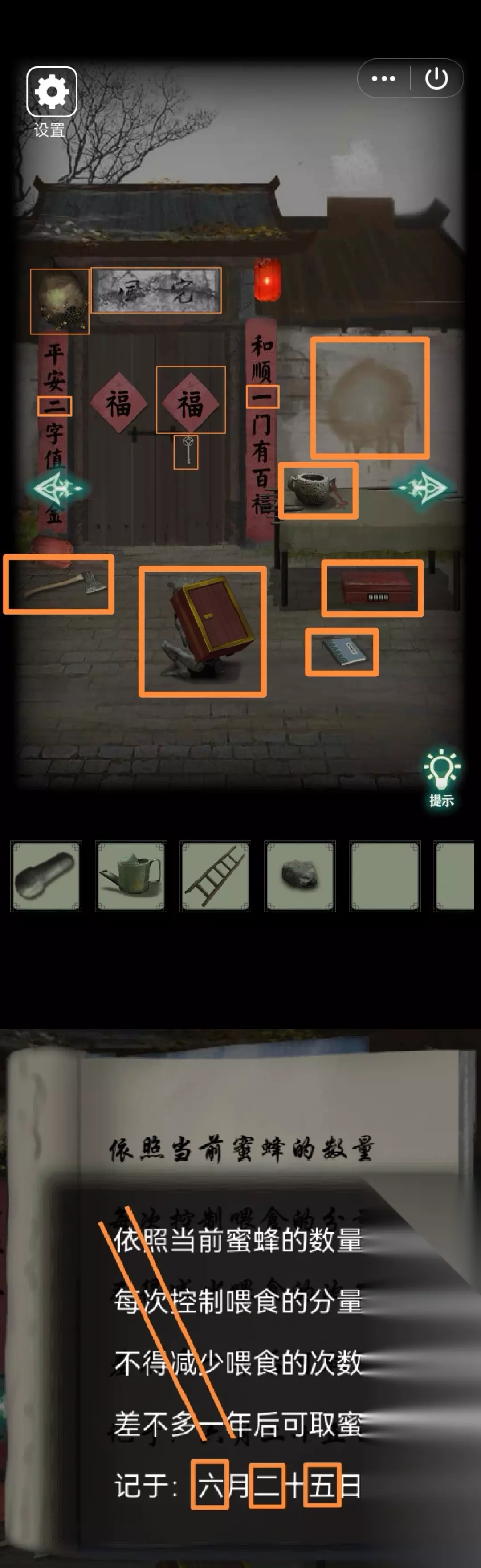 12.右转,地上拾取【斧头】。从左往右观察门口对联上的2个数字(二一),发现雕像上盒子4位八卦符号锁、蜜蜂喂养指导(斜着看“依次减一”、日期3个数字六二五)、桌下盒子3位大写数字锁、桌上研磨器研磨棒丢失、宅门锁上了、右边墙壁黏糊香甜、门匾左边蜂巢、此处为封宅。摇晃门上福字,得【钥匙】。根据发现的大写数字结合发现的转换规则(即六减一、二减一、五减一),用伍壹肆开桌下盒子,得【刷子】。