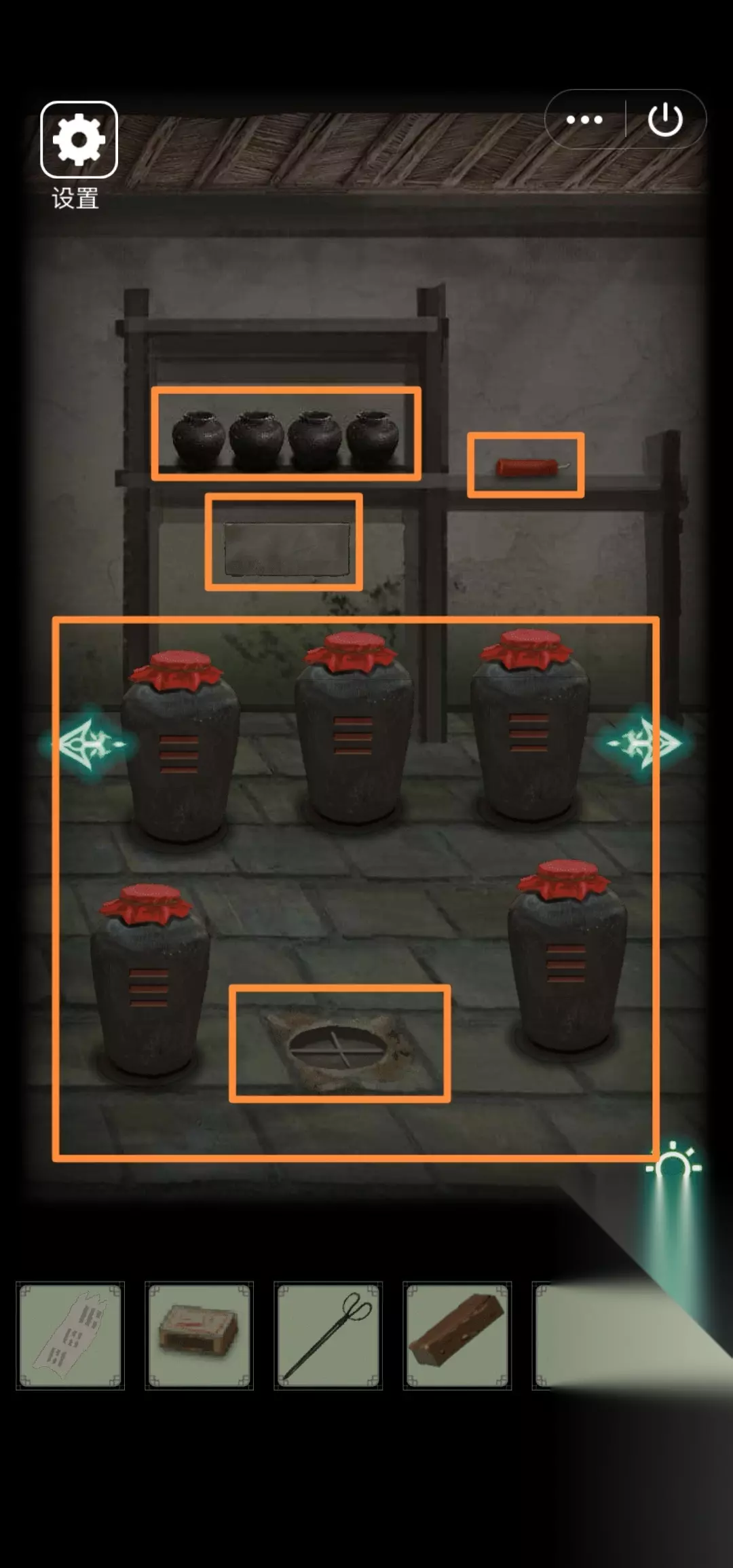 27.右转,架子上拾取【香烛】。发现地上5个带有八卦符号的酒坛、地上一个凸槽,把空酒坛放到凸槽上。点架子上罐子,发现墙上有暗门、罐子内有蛇,依次敲击罐子,从左往右观察4条蛇的高低位置