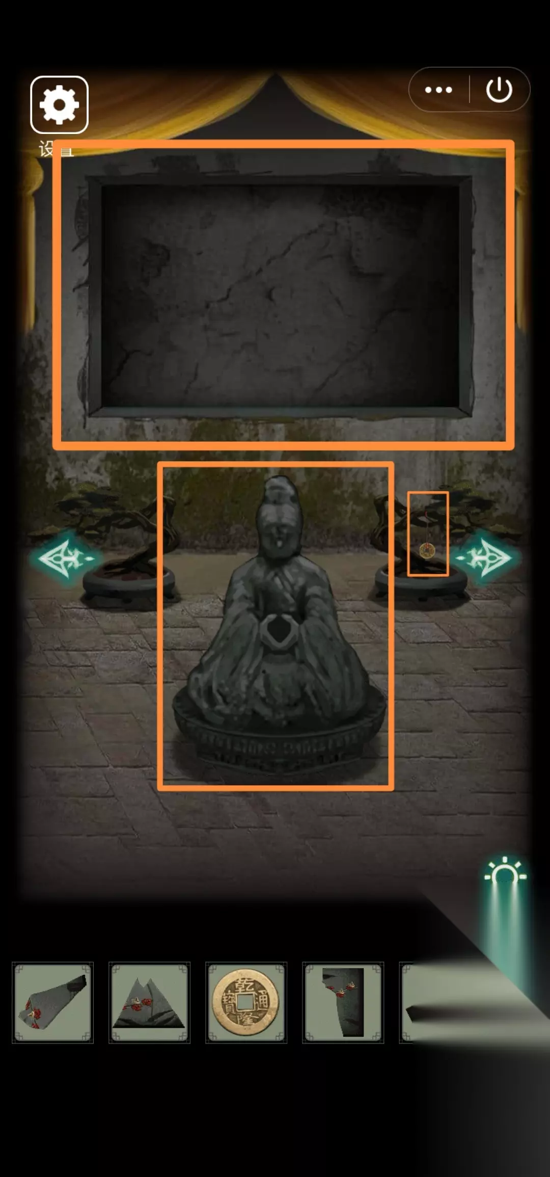 50.右转,右边盆栽拾取【铜钱(二)】(不太好触发)。发现地上神秘石像、墙上一面空凹槽。把符石(三)塞入石像,石像裂开露出新石像,得【石像碎块(一)】