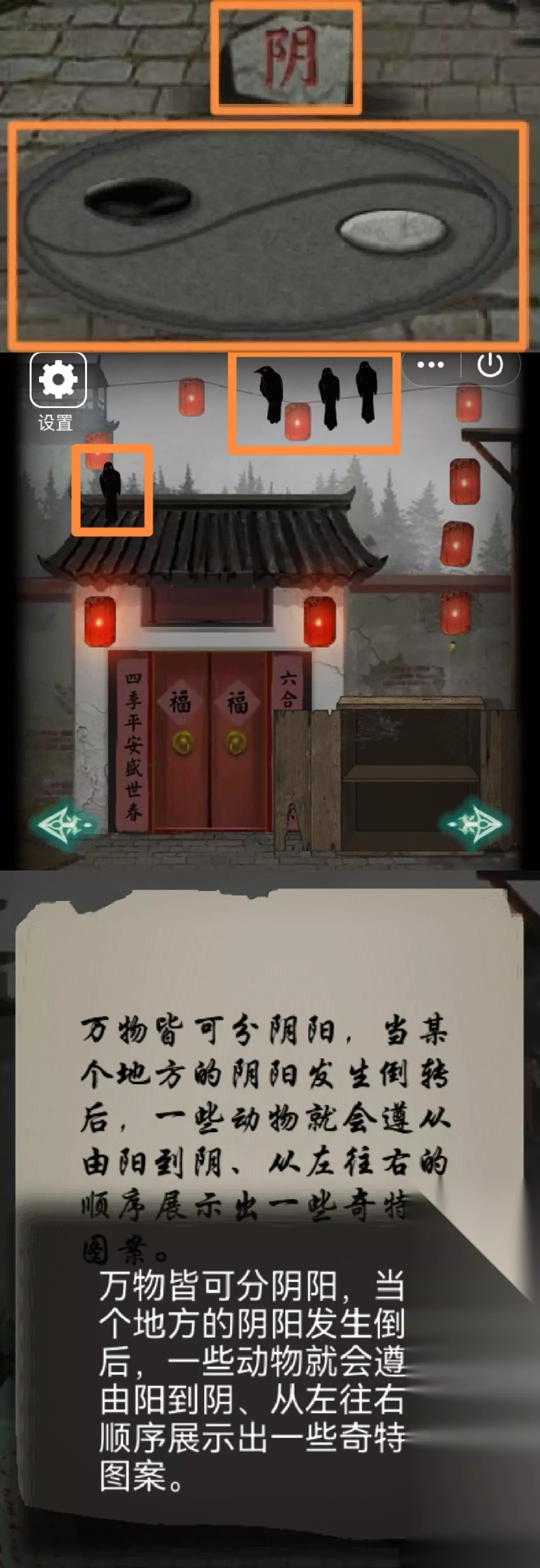 17.左转,把八卦图-阴鱼放入八卦图,八卦图变完整了,旋转八卦图,八卦当前的状态为阴 18.右转,从左往右观察上方乌鸦的聚集个数(壹叁)。组合16、18发现的数量结合9、17的转换规则(即贰贰壹叁)开盒子,得【玉佩-绿】