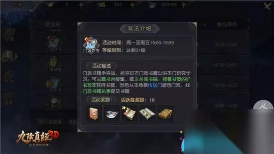 探索规则,巧夺天工之秘籍 门派夺书的盛会自周一至周五,每日傍晚七时至七时半举行,参与者需等级不低于31级方可加入。在这短暂而激烈的夺书时光中,玩家可穿梭于各大门派,潜入藏书台以搜罗珍贵书籍;或是在追逐与战斗中,从匆匆的偷书贼或怀有书籍的游子手中夺得书篓。任务完成后,通过门派的传送门返回,向执掌书籍的长者呈上所得,以换取丰厚的奖赏。