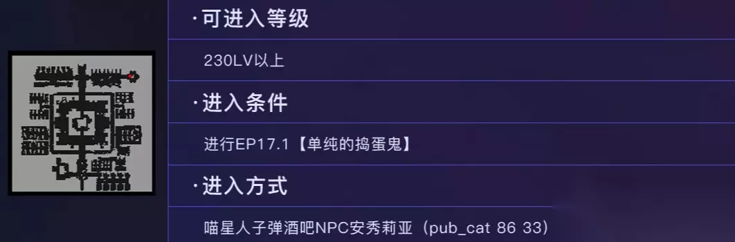 进入等级:230LV以上 进入条件:进行EP17.1【单纯的捣蛋鬼】 进入方式:喵星人子弹酒吧NPC安秀莉亚(pub_cat 86 33)