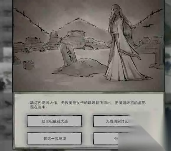 ① 继续探索: 选择以下奖励之一: 未知符文:六项灵根+15。 一块兽骨:获得坐骑驺吾(脚力700,魅力200)。 五彩小幡:获得后天气运“招魂幡”(战斗中濒死无敌5秒,共三次)。 什么都不要:获得后天气运“玲珑灯魂”(战斗中濒死立即满血满蓝满念,一次性)。 ② 功成身退: 获得后天气运“玲珑魂灯”。 三、选择三: 剧情后前往新魔宗,出现分支: