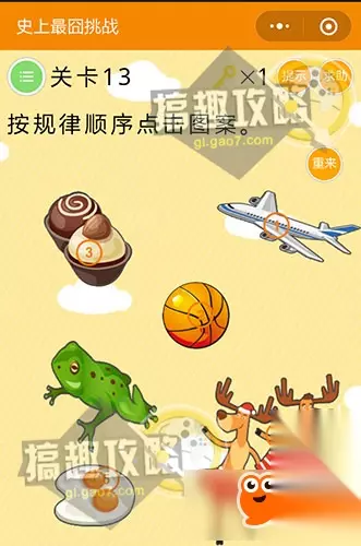 将左下角的猫移开,就能看到与众不同的蓝猫了。 微信史上最囧挑战第13关攻略: 按规律顺序点击图案。