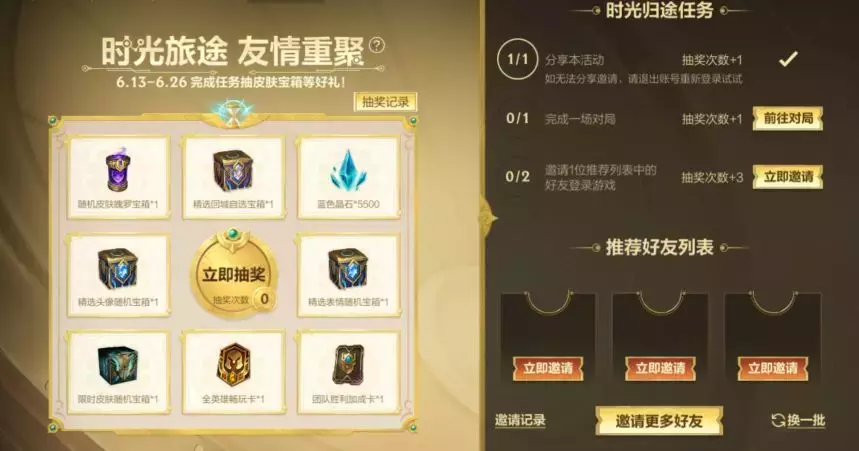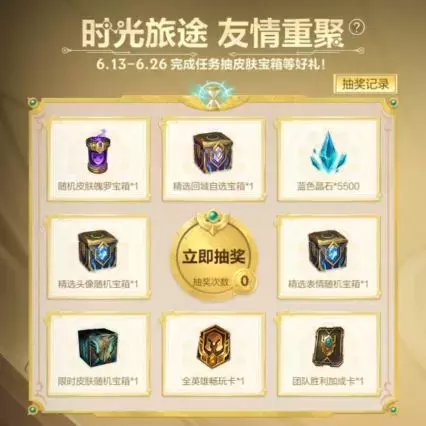 截止至6月26日,召唤师完成时光归途任务即有机会抽取随机皮肤魄罗宝箱、精选回城自选宝箱、精选头像随机宝箱等好礼~