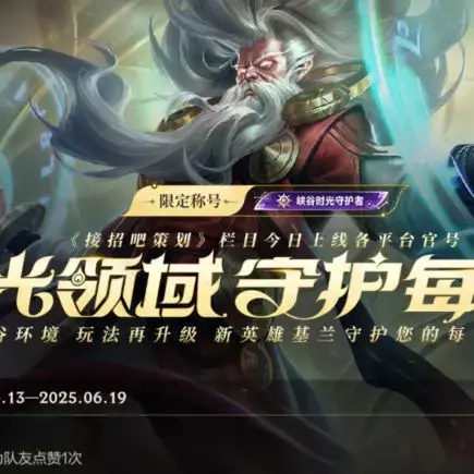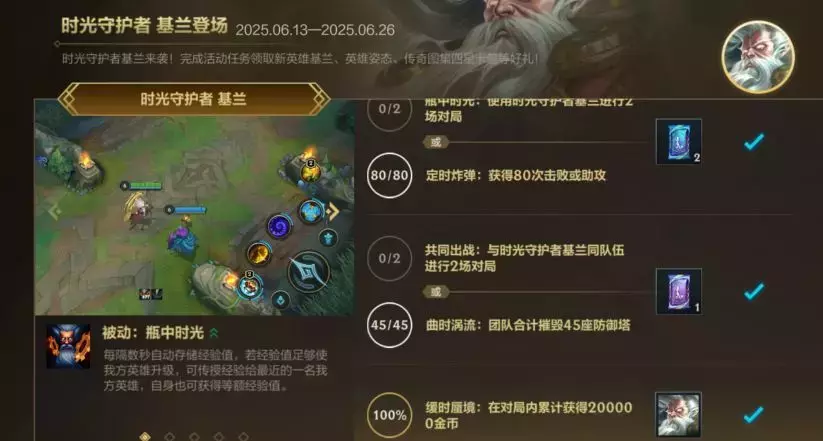 截止至6月26日,召唤师完成活动任务即可领取新英雄时光守护者 基兰、英雄姿态-掌控、传奇图集四星卡包(紫)等好礼~