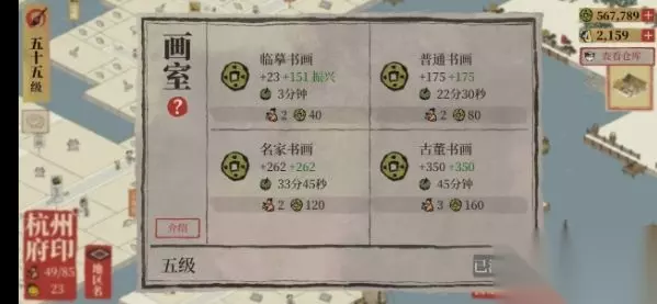 第二种,杭州画室 也是我自己刷铜板的方法。不想太肝的知府们,可以不升5级。杭州画室是性价比最高的刷钱建筑了,我在杭州摆了23个,收益相当可观。 第三种:苏州渔具店 适合相对佛系的。各个时长都有,升级24分钟,不升级48分钟或者其他时长的,利用碎片时间,抽空上去刷一下。