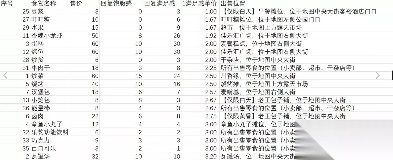 《大多数》食物性价比排名一览 由于在游戏中奋斗青年阶段玩家需要吃大量不同的食物且经济极其紧张,因此玩家需要尽可能选择高性价比的食物来满足需求。 食物性价比排名表: