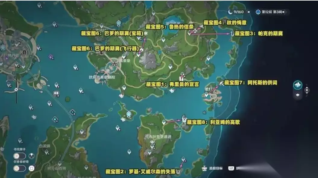 原神藏宝图宝藏位置在哪 4.2版本新开放区域的藏宝图 8张「藏宝图」:在4.2版本新开放的地区含有多张藏宝图可以获得。搜集完8张「藏宝图」以后,开启背包的「任务」归类,拉究竟,读纸条上蓝字的解迷提醒,根据这些内容,打开宝箱,更新纸条。8张「藏宝图」全都更新后,自动合成为1张「藏宝图」:虹彩蔷薇的理想,且跳天地万象隐藏成就:为了众人的心愿。4号「藏宝图」的前置是「17号水神瞳」;6号「藏宝图」的前置是「23号水神瞳」。 藏宝图位置归纳:利亚姆的高歌:水下-浅水区的大海蚌里。阿托斯的供词:记忆之象限的传送点周边,从遗迹入口进来转角的大海蚌里。巴罗的期冀:水下遗迹旁的海洋蚌里。帕克的期冀:水下遗迹旁的海洋蚌里。鲁热的信条:水下遗迹旁的海洋蚌里。秋的悔意:水下遗迹旁的海洋蚌里。罗基·艾威尔森:水下遗迹旁的海洋蚌里。弗里曼的宣言:水下遗迹旁的海洋蚌里。鹤观区域的藏宝图宝藏图残片:在鹤观地区,玩家需要完成鹤观四天的世界任务,之后在七天神像附近的浪船锚点处,捡取一个海螺,与一个灵魂对话后获得宝藏图残片。接着需要找到其他三个残片,第二个残片在原本有个罐子的区域,打破罐子拿到海螺;第三个残片地点未详细描述;第四个残片在知比山底下。搜集全部残片后,回到七天神像周边和灵魂对话,随后得到藏宝图,通过藏宝图来看,宝藏的地点就在“菅名山”里,发掘后获得宝贵宝箱,旁边还有一封信。