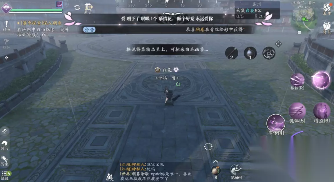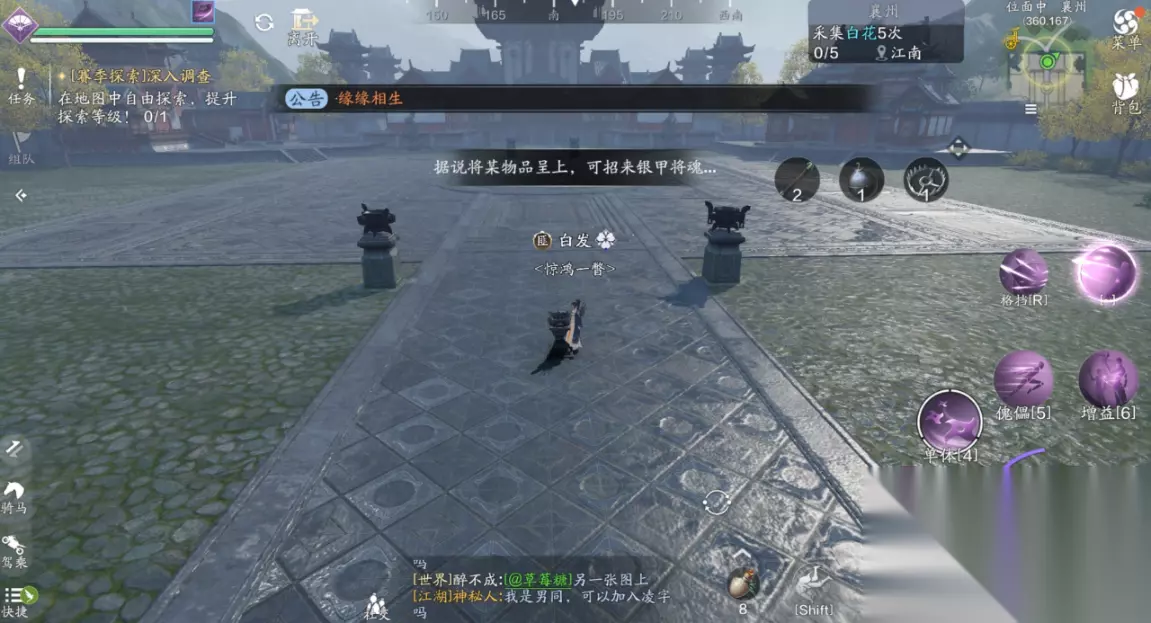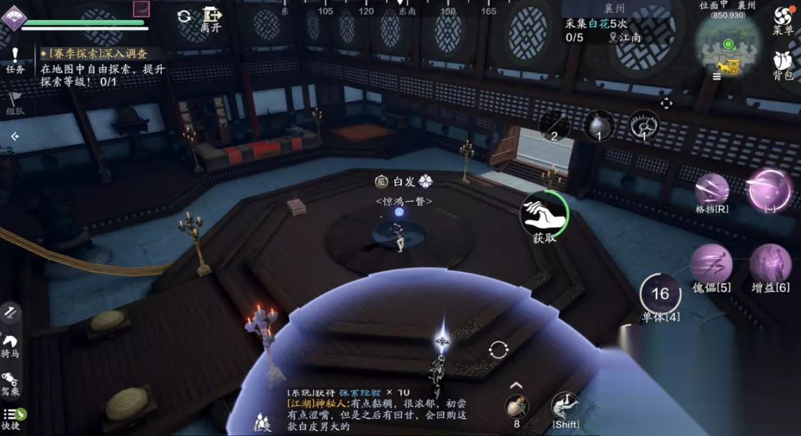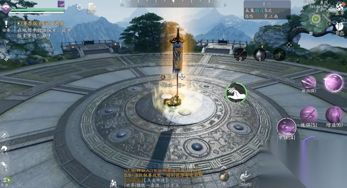三、江湖试炼 襄州探索需要完成5次江湖试炼的挑战,主线任务的笑道人也算一次,那么剩下的4个江湖试炼我们需要自己去寻找,并且都有非常复杂的前置任务。 (1)江湖试炼1:雪子(214.762) 这个江湖试炼一共有两个BOSS,我们分别前往天峰盟分舵以及青龙会分舵,两个地方都会给出提示放置某种物品,可招来白毛凶兽或者银甲招魂。