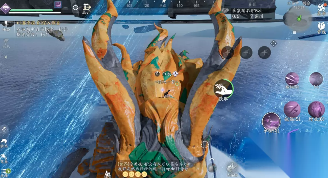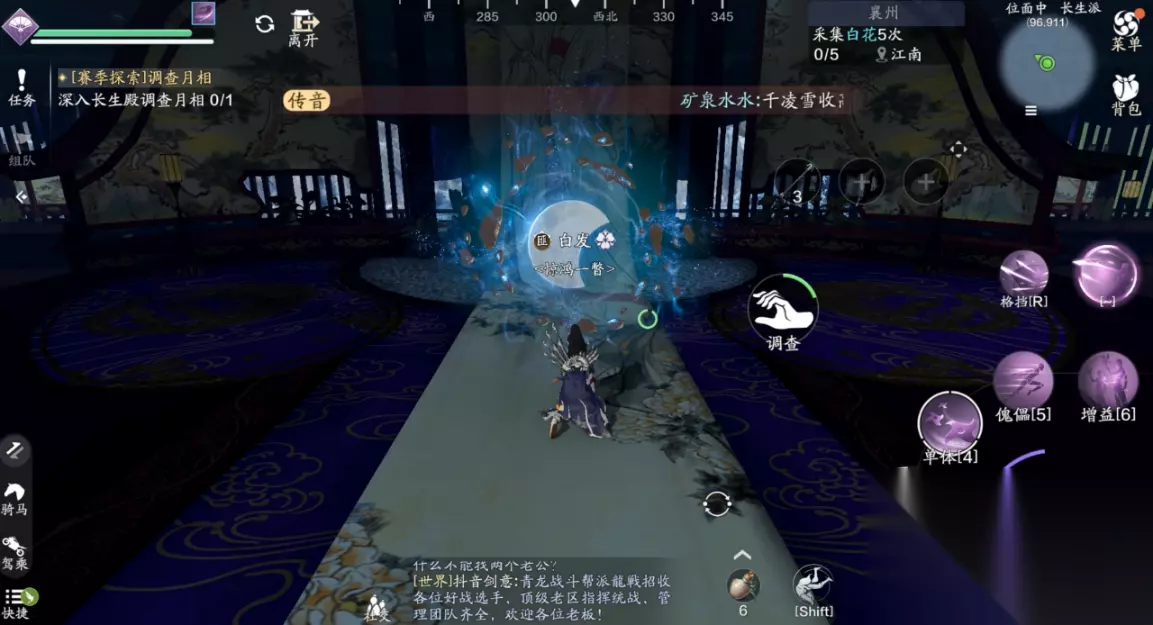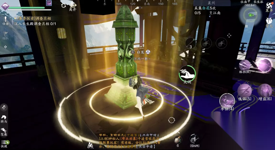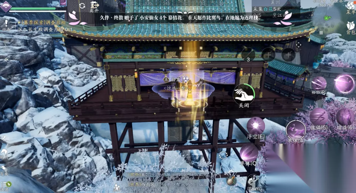 主线二:大荒台传送点:琉璃禁地(179.494) 第二个任务开始,我们需要自己寻找裂缝传送点。第二个传送点在琉璃禁地。 点击传送之后,我们会到次位面山海殿,少侠穿过大殿往大荒台即可看见平台上的月相机关。另外在山海殿内有一个天赋点,可以顺路拾取。
