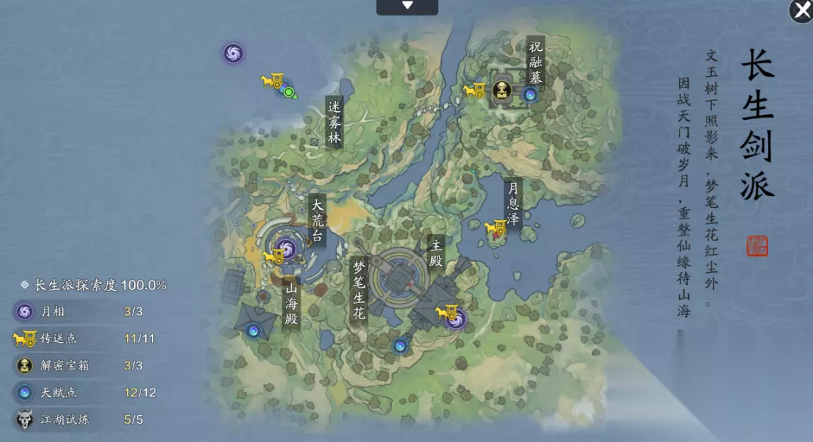 主线三:长生主殿传送点:望仙亭(782.64) 通过望仙亭的传说点之后,我们来到次位面梦笔生花。 月相以及传说点都在主殿内,少侠只需要往主殿的方向走即可。