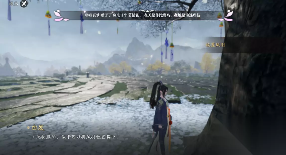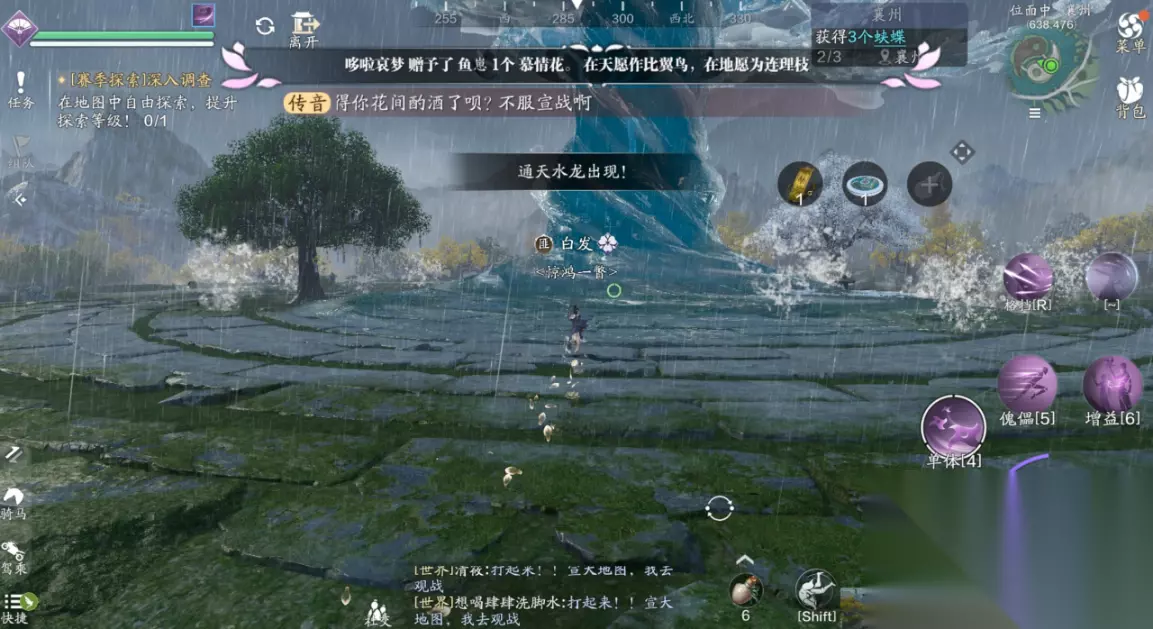 剪影并不是每一只精英怪都会出,是随机掉落,如果发现附近没有精英怪了,可以退出位面重新进入刷新小怪。 当我们凑齐了5个狼王剪影之后,试炼首领会直接在石林刷新,击败狼王之后完成一次江湖试炼挑战。 完成挑战之后我们再次回到刚刚开始遇到司空央的地方跟他对话,对话结束后会刷新一个天赋点,少侠不要忘记。 (4)江湖试炼:公子羽 这个是最复杂的江湖试炼,他的前置任务也十分繁琐,我们需要找到阴阳两把钥匙,激活阴阳树,开启通往挑战公子羽的次位面。 阳钥匙:凤羽(553.449) 阳钥匙凤羽在长生主殿最顶上的浮岛内,不是在屋顶,少侠不要围绕着屋顶寻找。 阴钥匙:龙泪(461.410) 阴钥匙龙泪在主位面的七星隐龙水潭的平台,少侠看见一个龙的石雕,中间那个柱子就是钥匙,点击获取即可。 传送通道:阴阳树(583.489) 找到钥匙之后,分别将它放置在两颗树上,随后中间就会出现巨大的水龙卷。
