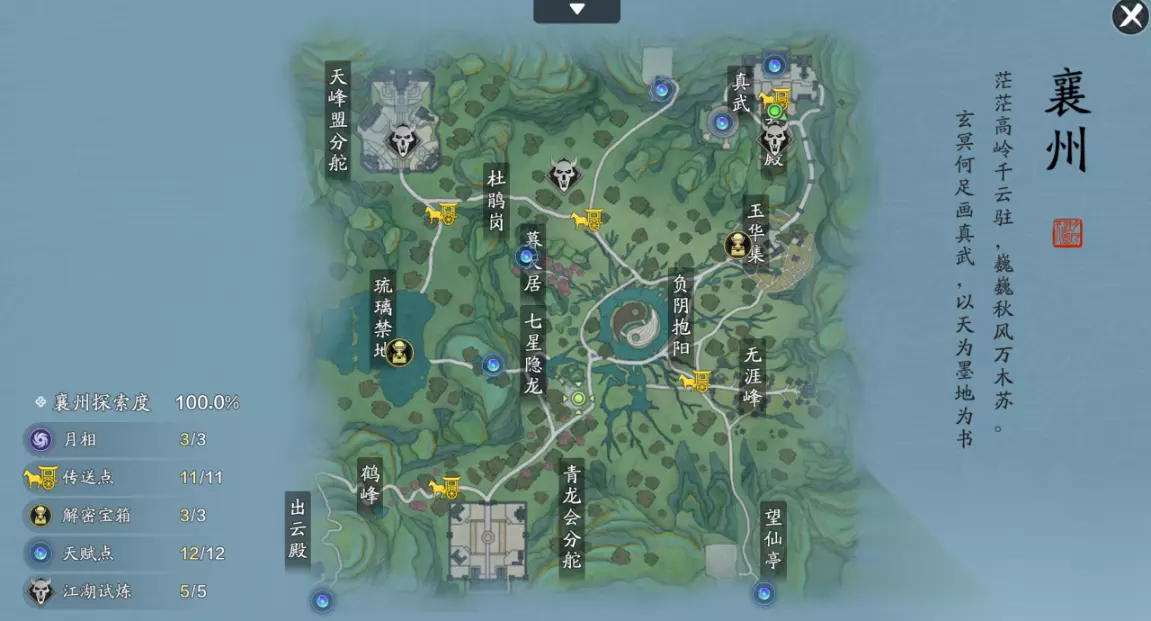 此时肯定很多少侠一脸懵,不知道如何传送,不要着急。我们什么也不用做,就站在水龙卷的旁边,等我们的技能图标出现传送二字,点击传送即可到达挑战公子羽的次位面。 动画结束后,我们会被传送到另一个位面,激活传送点之后前往前面的剑台迎接公子羽的挑战,挑战完成后最后一个江湖试炼也随之完成。 击败公子羽后,他身后的龙头有最后一个天赋点,不要忘记拾取噢! 四、解密宝箱 宝箱1:琉璃禁地(215.465) 熟悉的连线机关,只需要将树上的射线调整一下即可开启箱子,非常的简单。 宝箱2:玉华集(786.626) 我们在玉华集可以看见一个石碑,只需要根据石碑上面的字找到对应的轮盘即可。 ◆ 转盘机关1(801.630) ◆ 转盘机关2(840.616) ◆ 转盘机关3(824.645) 宝箱3:祝融墓(781.829) 依旧是我们熟悉的水桶机关,3个水桶就在附近,这个地图没有小怪的存在,唯一要注意的就是落雷,落雷十分密集,要是被打中的话,水桶会丢失并且重新刷新。 好啦,到此为止襄州试炼的所有探索进度全部完成,我们下期再见吧!