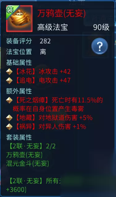 玩家可通过装备界面上的“法宝”按钮进入法宝界面。角色一共有8个法宝栏位,对应先天八卦中的乾、巽、坎、艮、坤、震、离、兑。每种法宝都只能放置在其指定的位置中。 二、法宝的种类 法宝按照颜色与稀有程度,可分为黄色、蓝色、红色、和仙家法宝四类,其中黄色和蓝色法宝为普通法宝,红色为高级法宝。 普通法宝和高级法宝按照法宝的样式分,一共有8种。每种法宝固定摆放在一个位置。 东皇钟 ——乾位 九芝盖 ——巽位 玲珑心 ——坎位 缩地尺 ——艮位 补天石 ——坤位 紫金葫芦——震位 万鸦壶 ——离位 混元金斗——兑位 三、法宝的属性加成 法宝的属性包含基础属性、额外属性和套装属性三种。除了单件法宝的加成外,玩家可以通过集齐1-6个有相同属性的法宝激活套装属性,为角色带来气血、防御、攻击、命中、躲避、格挡、抗性等全方位的属性加成。