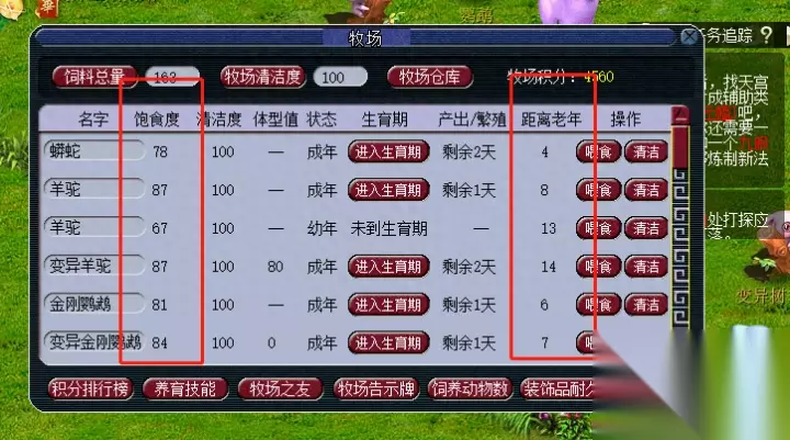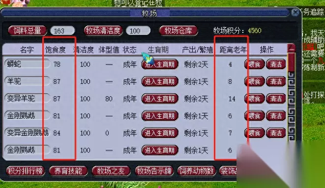 收完后,点击生育期,所有成年的宝宝都排列好了,然后你还是看饱食度和距离老年。只要距离老年这个数大于左边这个产出/繁殖,你就把饱食度喂到80以上这时候当然有距离老年小于产出和繁殖的,基本上就是距离老年是1天或者2天,产出繁殖是2天-3天,就是一个大一个小,或者俩数一样。 这种情况就看你的窝多不多,如果窝多,就不喂饲料。如果窝少。就喂到80。如果窝便宜,就不喂饲料,直接卖。如果窝贵,就喂饲料到80趴窝。如果饱食度小于71,只喂珍惜宝宝,所有的都操作完了,直接带着去趴窝了。