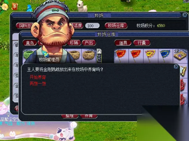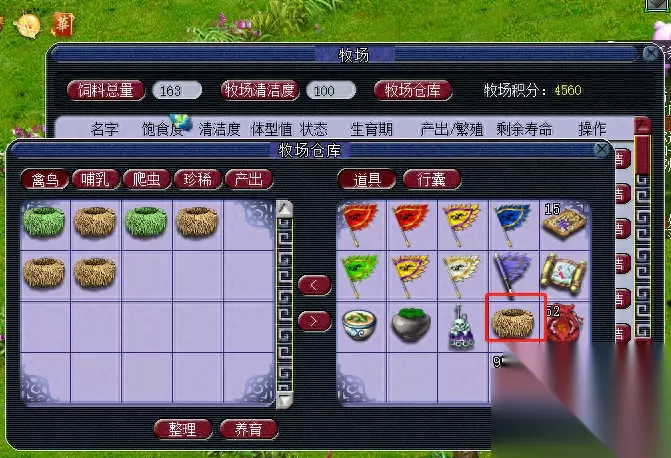 然后点管理员,打开牧场仓库,右键点击你的包裹里面的窝,窝就到仓库了。然后你点仓库里面的这个,点击下面的养育就行了。接着牧场仓库左边的牧场清洁度,每天进来先点这个保持100,花费10000银两,再点左边的饲料总量。点一下,然后右键点击你包裹的饲料,点存入就全部存入了,如果不想全部存入就自己输入数字。