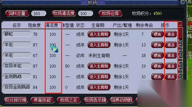 如上图所示看到这个清洁度没有,这个是宝宝的清洁度,也是要保持100,进来后先点一下右边的清洁。 第一页清完了,然后你点清洁度这三个字,然后会自动排序,清洁度不满的就上来了。然后清洁一下,再点两下清洁度,然后又排序了。清完后再点两下,这样循环到全部清完。