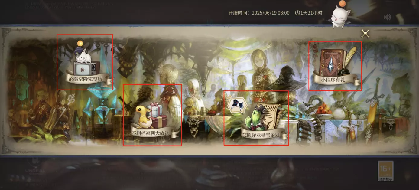 完成更新后,冒险者们可点击右侧按钮,查看企鹅空降完整版、不删档福利大放送、艾欧泽亚寻宝企划、小程序有礼的相关内容。
