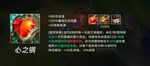 英雄联盟最近新上线了一个装备,这个装备的名字就是心之钢,那么这个装备怎么样呢?有着什么样的特色呢?相信不少玩家对于它的装备属性都非常好奇,想要知道它究竟有多厉害,那么小编就来给大家介绍一下这个全新的装备吧!感兴趣的小伙伴,快来一起看看吧! 英雄联盟心之钢装备介绍 1、心之钢基础属性800生命值、200%基础生命回复、20技能急速 2、被动,庞然吞食:700码内有一名敌方英雄的时候,3秒里持续充能一次对英雄的强力攻击,充能攻击对敌人造成基于生命值百分比的物理伤害,并且为自身提供相当于该伤害10%的永久最大生命值; 3、这个装备基本上是战士必备的了,裸出触发效果可以提供20伤害,触发效率也很高,随着生命值的不断提升伤害也越来越高,收益十分可观。 4、在s13季前赛版本更新后这个装备将会加入游戏,感兴趣的玩家可以去游戏内查看和使用。 英雄联盟心之钢层数叠加方法 1、心之钢的被动可以充能攻击敌人对其造成生命值百分比的物理伤害,同时自身将获得相当于该伤害10%的最大生命值加成; 2、这个装备最适合战士英雄,但是在上线之后大乱斗基本上人手一个,也有很多玩家戏称游戏变成了“心之钢联盟” 叠加层数不仅有血量加成,英雄体型也会变大;